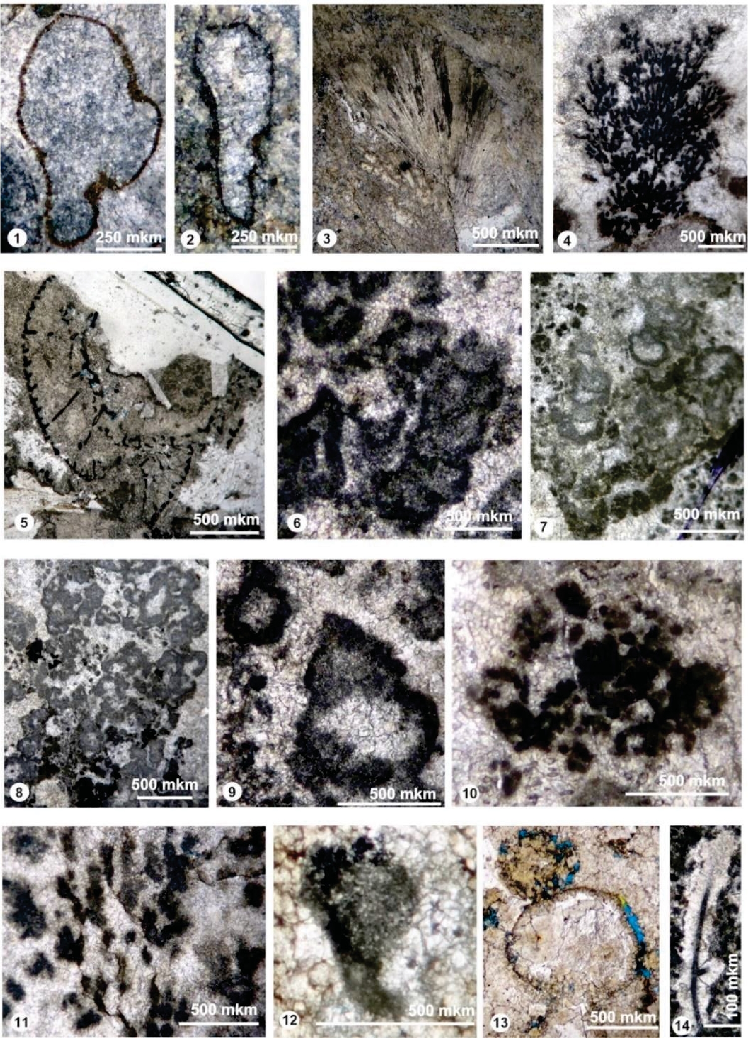 Рис. 7. Фототаблица палеонтологических находок из осинской подсвиты. Фиг. 1. Dubius uncatus. шл. № 140692 гл. 2602,69 м; Фиг. 2. Ramifir angulosus. шл. № 140724 гл. 2633,39 м; Фиг. 3. Botomaella sp. шл. № 140716 гл. 2626,54 м; Фиг. 4. Epiphyton scapulum. шл. № 140800 гл. 2684,48 м; Фиг. 5. Archaeocyatha. шл. № 140806 гл. 2688,80 м; Фиг. 6. Renalcis seriata. шл. № 140808 гл. 2690,65 м; Фиг. 7. Renalcis seriata. шл. № 140830 гл. 2712,42 м; Фиг. 8. Renalcis polymorphus. шл. № 140830 гл. 2712,42 м; Фиг. 9. Renalcis granosus. шл. № 140808 гл. 2690,65 м; Фиг. 10. Korilophyton inopinatum. шл. № 140802 гл. 2686,05 м; Фиг. 11. Renalcis levis. шл. № 140763 гл. 2661,59 м; Фиг. 12. Namacalathus sp. шл. № 118398 гл. 2567,65 м; Фиг. 13. Namacalathus. шл. № 110540 гл. 2488.72 м; Фиг. 14. Tubophyllum viktorii. шл. № 140814 гл. 2696,52 м. Фиг. 1–11, 14 – 3Х. Фиг. 12 – Западно-Ярактинская 361; 13 – Западно-Ярактинская 45