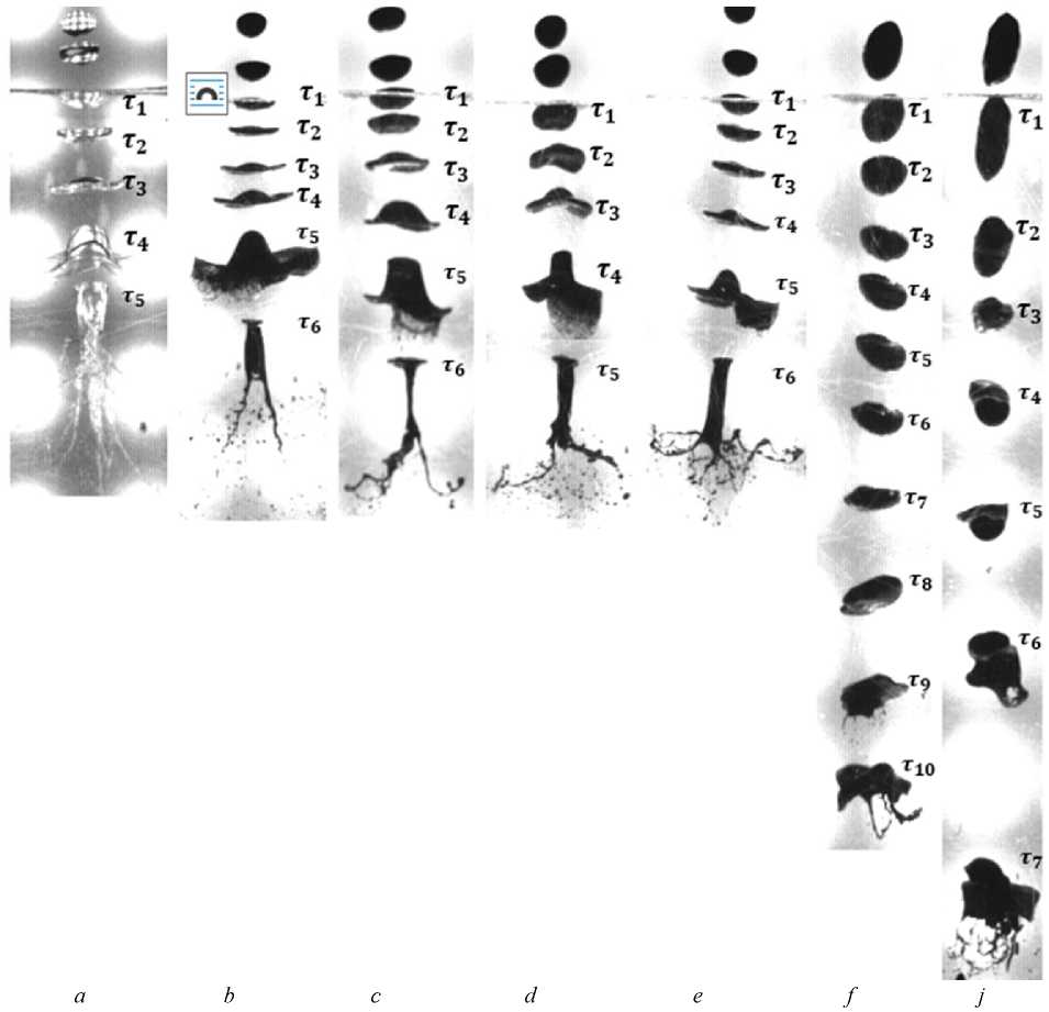Рис. 2. Типичные кадры процесса диспергирования капель воды (a) и ВУТ (b–j). Соотношение в системе уголь/вода: a – 0/100; b –10/90; c – 20/80; d – 30/70; e – 40/60; f – 50/50; j – 55/45