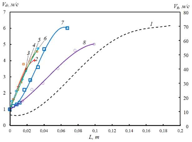 Fig. 4. Dependence of velocity of air (Vg – dependence 1) and liquid droplets (Vdr – dependences 2–7) on the distance traveled along the nozzle path to the moment of fragmentation, at different concentration (φ) of coal in suspension: 1 – air; 2 – water droplet (φ=0); 3 – CWF droplet (φ=10); 4 – CWF droplet (φ=20); 5 – CWF droplet (φ=30); 6 – CWF droplet (φ=40); 7 – CWF droplet (φ=50); 8 – CWF droplet (φ=55)
