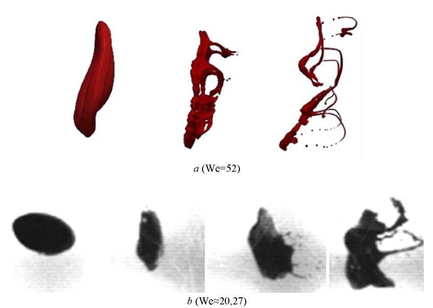 Рис. 7. Результаты численного моделирования (а – приведенные в [23]) и типичные кадры процесса дробления одиночных капель ВУТ (b – полученные экспериментально, рис. 2)