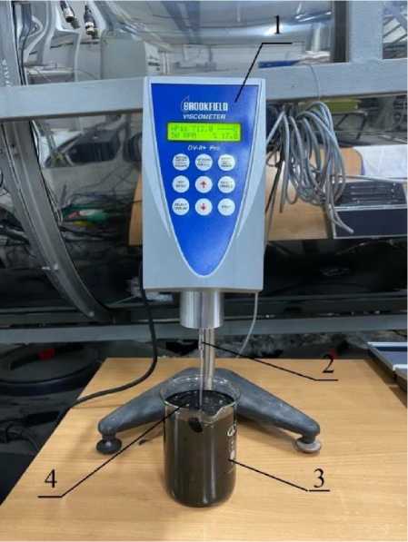 Fig. 1. Experimental setup for measuring the dynamic viscosity of a coal-water suspension (CWS) (1 – rotational viscometer; 2 – spindle; 3 – cylindrical glass vessel with the suspension under study; 4 – Bio-CWS)