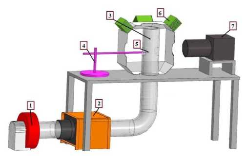 Рис. 2. Схема экспериментального стенда по определению временных характеристик: 1 – компрессор; 2 – высокотемпературная печь; 3 – камера сгорания; 4 – держатель; 5 – капля ВУС; 6 – магнетроны (4 шт); 7 – высокоскоростная видеокамера