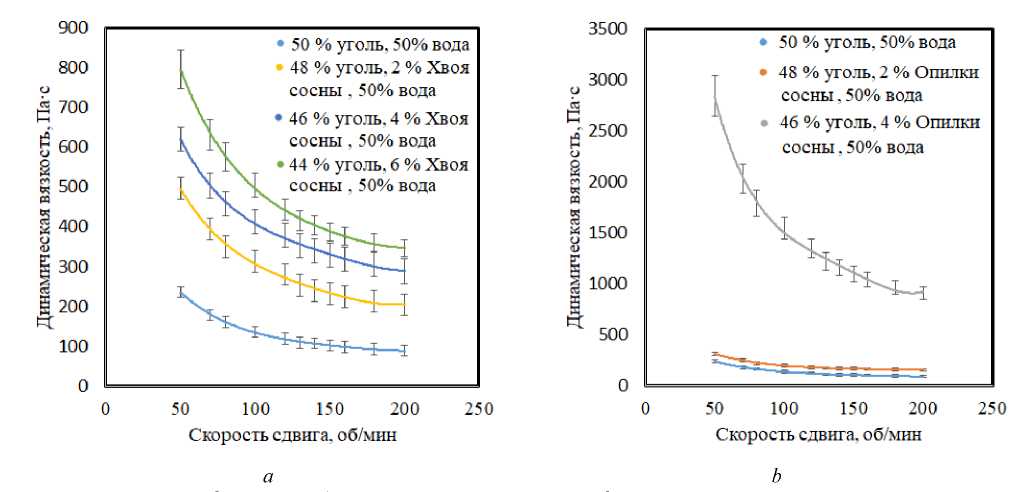 Анализ зависимостей, приведенных на рис. 3, a, показал, что добавление даже 2 % хвои сосны приводит к увеличению вязкости практически в два раза по сравнению с водоугольным топливом без введения в структуру топлива биомассы. Добавление 4 % (по массе) биомассы в ВУС приводит к увеличению вязкости в 3,2 раза, при 6 % – почти в 4 раза. На рис. 3, b приведены зависимости динамической вязкости при разных скоростях сдвига для ВУС и Био-ВУС с добавлением опилок сосны.