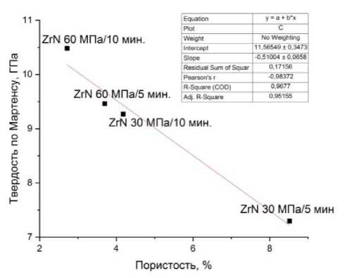 Было установлено, что при снижении пористости достигается наибольшая твердость. Наблюдается прямо пропорциональная зависимость твердость–пористость. Для исследуемых образцов значения твердости находились в интервале от 7,3 ГПа до 10,4 ГПа. При экстраполировании данных было установлено, что беспористый образец будет иметь твердость по Мартенсу 11,56 ГПа.