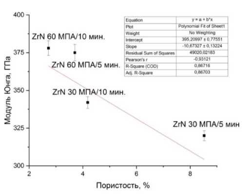 J. Adachi с соавторами измеряли модули упругости для нитрида циркония, спеченного методом искрового плазменного спекания. Авторы наблюдали схожую картину, для образца с пористостью 8 % модуль упругости составил 288 ГПа, который уменьшился до 156 ГПа при возрастании пористости до 18 %. При этом Adachi с соавторами также уделяли внимание зависимости твердости от пористости. Для образца с пористостью 8 % твердость составила 10 ГПа, которая уменьшился до 5 ГПа при возрастании пористости до 18 % [20].