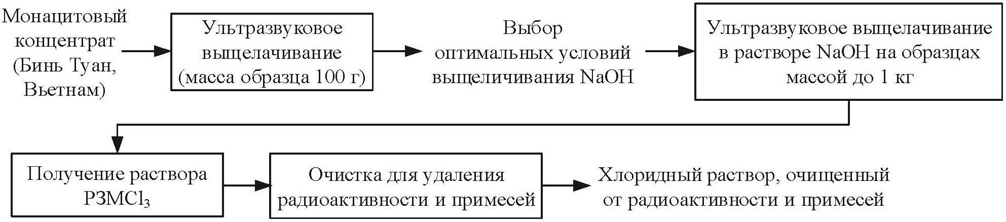 Results and conclusions. The optimal conditions for leaching batches of samples weighing from 100 g to 1 kg were determined. The authors have carried out the research on the separation of radioactive elements and impurities in a solution of rare earth chlorides, obtaining a solution of rare earth chlorides purified from radioactive components and impurities. It was shown that ultrasonic exposure eliminates the disadvantages of traditional fusion technology with NaOH, which can be used for deep processing of Vietnamese monazite concentrate. The conditions for obtaining REE chlorides from a previously opened monazite concentrate are given.