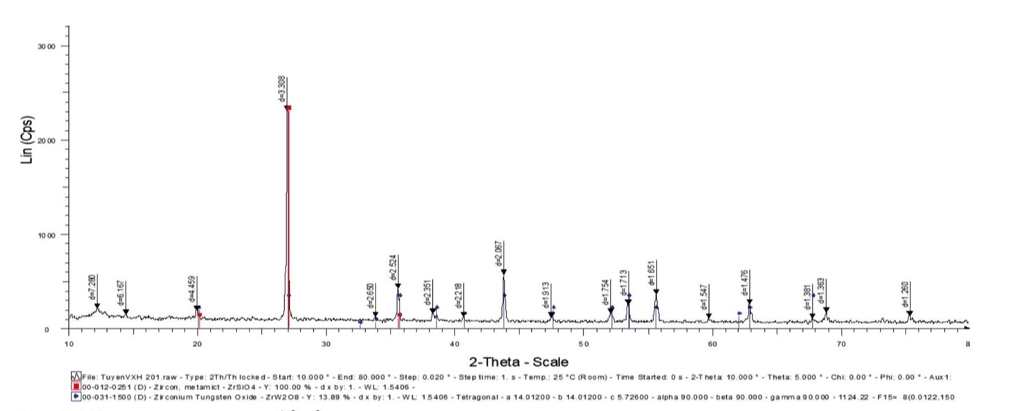 При проведении исследований с несколькими образцами массой 1 кг образовался нерастворимый остаток массой от 185,9 до 190,9 г. Остаток имел белый цвет и отличался от желто-коричневого цвета исходного МК. При сравнении рентгеновского спектра (XRD-метод) остатка (рис. 10) со спектром стандартного образца циркона показано, что нерастворимый остаток в основном состоит из циркона, а содержание монацита и других примесей незначительно.
