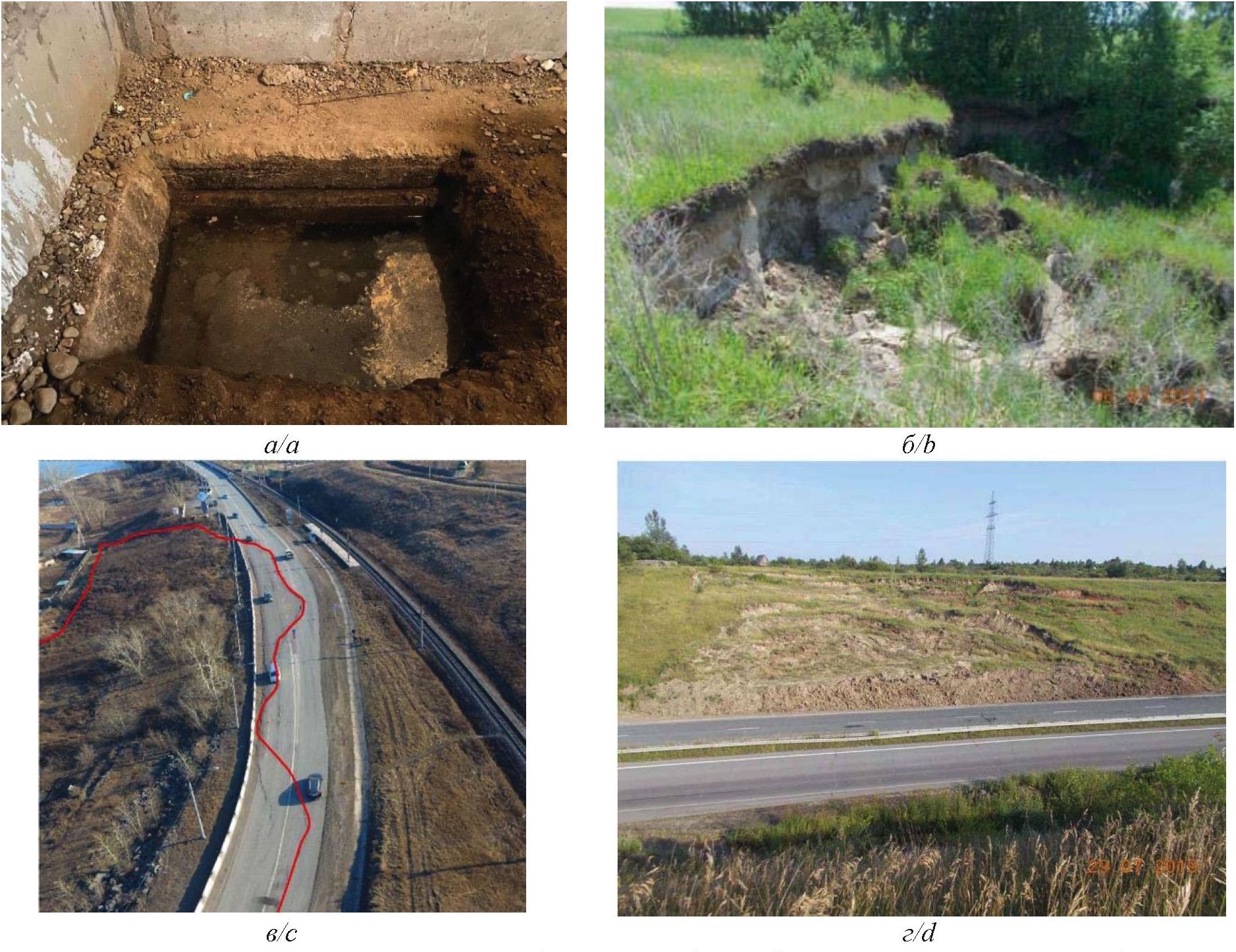 Рис. 1. Проявления геологических процессов: а) подтопление подвала здания Госэкспертизы РХ в г. Абакане (2021 г., Д.Ю. Сагалаков [20]; б) овраг вблизи с. Мал. Минуса; в) оползень на автомобильной дороге Абакан–Подсинее на участке км 7+300 – км 7+600 (2020 г., Д.Ю. Сагалаков, [21]); г) оползень вблизи автомобильной дороги Абакан–Минусинск Р-257 в районе Колягинских холмов [22]