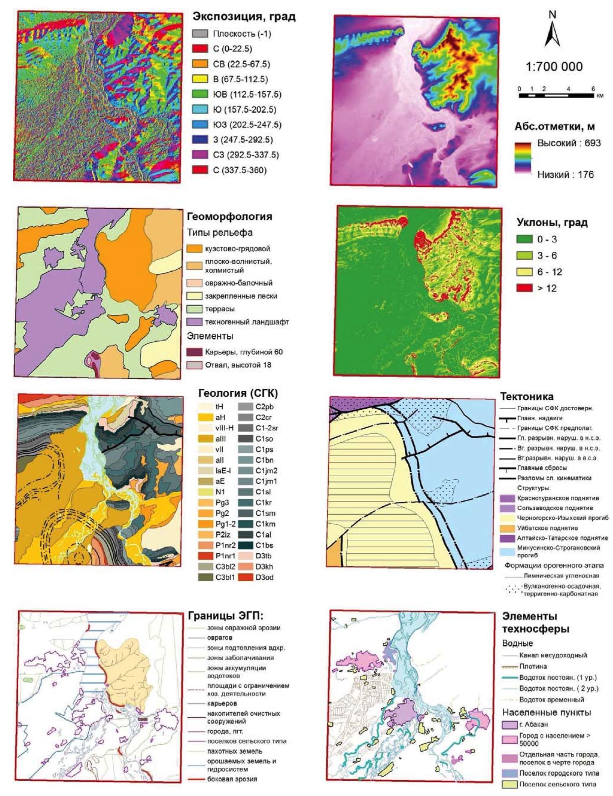Проведенный анализ литературных и фондовых материалов позволил установить, что для территории характерны гравитационно-эрозионные, оползневые процессы и процессы подтопления. Так, процессы гравитационно-эрозионного комплекса развиваются в береговых зонах рек и водохранилищ. Оползневые процессы встречаются в Алтайском, Боградском и Усть-Абаканском районах. Процессам подтопления подвергаются около 30 населенных пунктов, расположенных в степных и предгорных районах. В их число входят гг. Абакан, Черногорск, Минусинск, пгт. Усть-Абакан, сельские населенные пункты Алтайского, Аскизского, Бейского и Таштыпского районов. Практически вся территория г. Абакана находится в зоне подпора грунтовых вод, развитой в связи с заполнением Красноярского водохранилища. Подтоплению подвержены как старые районы города, так и вновь застраиваемые районы.