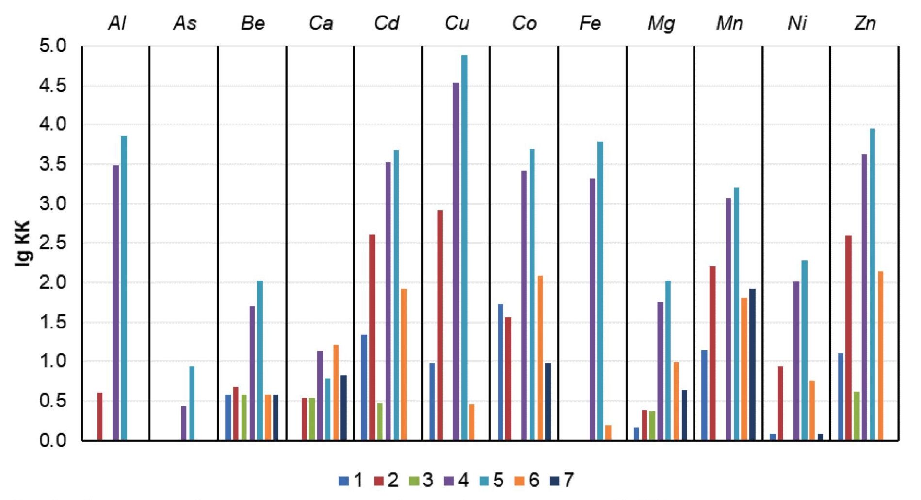Содержания металлов в подземных водах превышают кларки концентраций (КК) [18] на один–пять порядков (рис. 4). Самые существенные превышения КК (в тысячи раз) отмечаются в скважинах № 4 и 5 для Al, As, Be, Cd, Cu, Co, Fe, Mg, Mn, Ni, Zn. В скважине № 2 значения КК снижаются на один–два порядка. В скважинах № 1 и 6 превышения кларков (сотни–десятки раз) обнаружены для Cd, Cu, Co, Mn, Ni и Zn. В скважине № 7 отмечаются превышения по Be, Ca, Co, Mg, Mn и Ni (рис. 4).