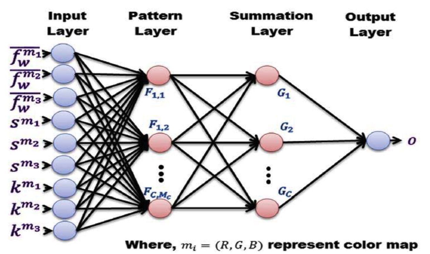 Автор обосновывает свой выбор тем, что вероятностный нейрон сети имеет сходство с моделью обратного распространения в том, как он направляется. Однако у PNN есть отличия в процедуре обучения. Архитектура PNN состоит из входного слоя, слоя паттернов (pattern layer), слоя суммирования и выходного слоя. Слой паттернов имеет сходство с сетью с радиальными функциями, однако слой суммирования имеет подобие конкурентной сети. Архитектура PNN, использованная автором, показана на рис. 1.