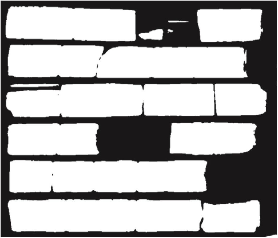 Однако в ходе эксперимента для того, чтобы избежать проблем с неоднородными образцами [23], корректного наложения ультрафиолетовых фотографий и более эффективного обучения сети, было принято решение первоначально выполнить сегментацию образцов керна на дневных изображениях. На первом этапе сегментации производилось обучение нейронной сети распознавать, где на фотографии находится порода, и где прочие объекты. На основе каждой фотографии в обучающем наборе с использованием средств Photoshop была создана бинарная маска (содержащая строго два цвета – чёрный и белый), где чёрный цвет – отсутствие породы, белый – её наличие. На рис. 8, 9, соответственно, представлены фотография керна для обучения U-Net и маска фотографии керна.