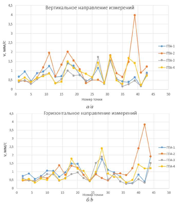При проведении анализа причин высокой вибрации дополнительно были исследованы вибрации ТПО. Согласно [28], значения частот колебаний, при которых анализируется вибрация трубопроводов, разделены на низкочастотное (НЧ) и высокочастотное (ВЧ). Были проведены замеры среднеквадратичных значений (СКЗ) виброскорости в характерных точках ТПО (рис. 1) четырех агрегатов, в НЧ (рис. 2) и ВЧ (рис. 3) диапазонах.