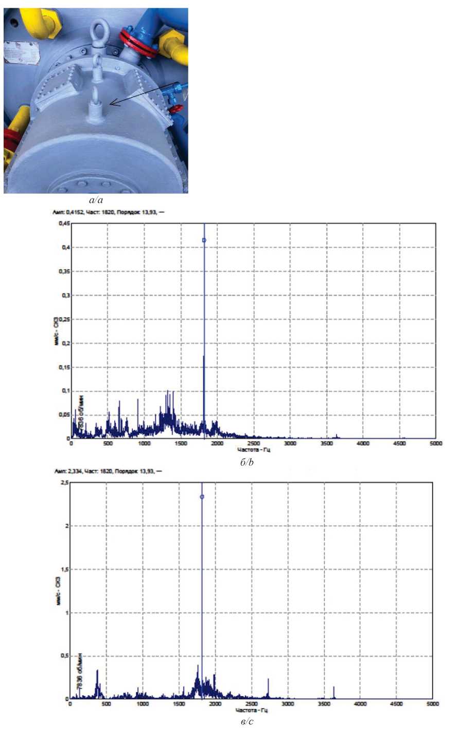 Рис. 5. а) корпус магнитно-упорного подшипника; б) спектр вибрации корпуса магнитного подшипника; в) спектр вибрации корпуса магнитно-упорного подшипника