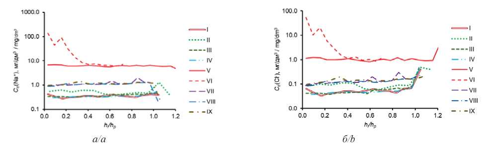 Fig. 2. Changes in Na (a) and Cl (b) concentrations in acidic extracts from peat in the taiga zone of Western Siberia depending on the relative depth hi/hp; legend: hi is the average depth of the sampling interval; hp is the depth of peat deposits; when sampling organo-mineral deposits and mineral soils (hi/hp>1); objects: I is the upland area of the Vasyugan bog (ridge-hollow complex, ridge; 09.11.2018); II is the upland area of the Vasyugan bog (pine-sphagnum-shrub bog is "ryam"; 21.03.2017); III is the high-moor-peat bog area of the Vasyugan bog ("ryam"; 09.11.2018); IV is the high-moor peat bog area of the Vasyugan bog; 09.11.2018); V is the low-moor peat Obskoe fen (the “background” area near the village of Nashchekovo; 26.11.2018); VI is the low-moor peat the Obskoe fen (polluted area near the village of Melnikovo; 26.11.2018); transitional Timiryazevskoe swamp (25.11.2019): VII is the center of the swamp; VIII is the area between the center and the outskirts; IX is the edge of the swamp with elements of eutrophic vegetation