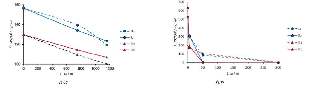 Fig. 4. Changes in measured and calculated concentrations of Na+ and Cl– ions in waters (active horizon) of the low-moor peat Obskoe fen (a) at the discharge site of domestic wastewater in the village of Melnikovo (the center of the Shegarsky administrative district of Tomsk region; 09.11.2018; the initial data on the chemical composition of waters and peat were published in [14]; Na+ and Cl– contents were calculated based on the dependence on specific electrical conductivity) and the raised bog in the area of the sludge pit at the Zapadno-Moiseevskoe oil field (b) in the catchment area of the Vasyugan river (14.08.2003); legend: Ia and Ib are the measured and calculated (8), (9) Na+ concentrations; IIa and IIb are the measured and calculated (8), (9) Cl– concentrations; C is the concentration; L is the distance from the source of pollution: a) wastewater outlet; b) sludge pit