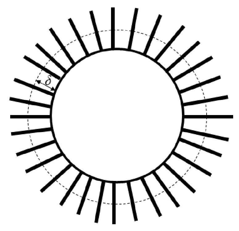 Учёт оребрения внешней поверхности внешней трубы термостабилизатора в рамках классической теплофизической теории не применим, поскольку эта теория предполагает конвективный теплообмен внешней среды с рёбрами, а замороженный грунт является неподвижной средой. Поэтому предлагается развить концепцию скин-фактора [25], хорошо зарекомендовавшую себя в задачах подземной гидромеханики с техногенными трещинами в нефтенасыщенных пластах, для описания эффективности конструкции термостабилизатора с оребрением. Наличие техногенной трещины увеличивает приток жидкости к скважине. Как правило, на практике при использовании концепции скин-фактора для характеристики этого эффекта вводится эффективный увеличенный размер скважины, граница которой проходит по половине длины образовавшейся техногенной трещины. При развитии концепции скин-фактора в силу аналогии увеличение теплового потока за счёт оребрения учитывается увеличением размеров внешней трубы термостабилизатора таким образом, чтобы её эффективная граница проходила посередине рёбер. Поэтому предполагается введение эффективного радиуса внешней трубы термостабилизатора как её исходного радиуса с добавкой дополнительного размера δ, м, принимаемого равным половине длины рёбер (рис. 4). В моделируемой задаче рассматривается термостабилизатор с равномерным оребрением одинаковой длины по всей его поверхности. Регулирование геометрических размеров и расположения ребер позволяет более интенсивно воздействовать охлаждающим тепловым потоком на отдельные участки грунта, что будет рассмотрено в последующих работах.