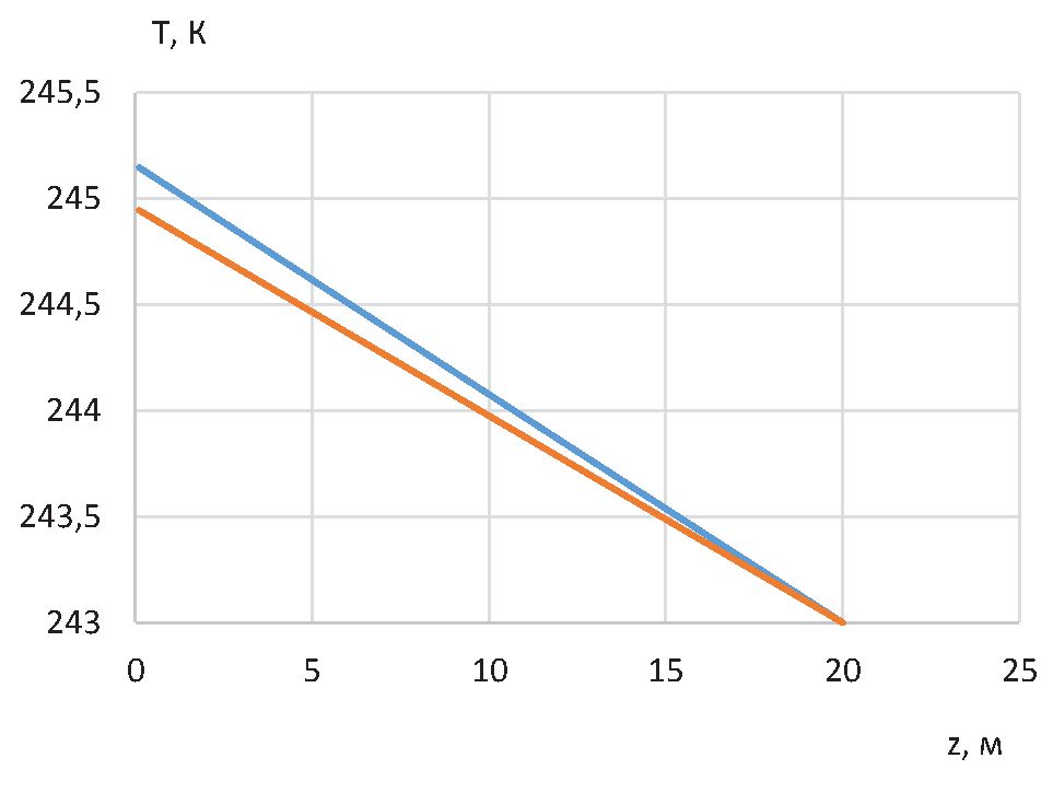 При движении хладагента в термостабилизаторе снизу вверх в зазоре между внутренней и внешней трубами происходит испарение хладагента за счёт теплового потока из грунта и наблюдается рост температуры (рис. 6). При наличии оребрения наблюдается более интенсивный теплообмен между грунтом и термостабилизатором, что приводит к повышению температуры хладагента. При этом в обоих случаях давление за счёт гидростатических и межфазных сил снижается (рис. 7). Добавочное изменение давления за счёт изменившегося теплового потока из-за оребрения внешней поверхности внешней трубы термостабилизатора незначительно.