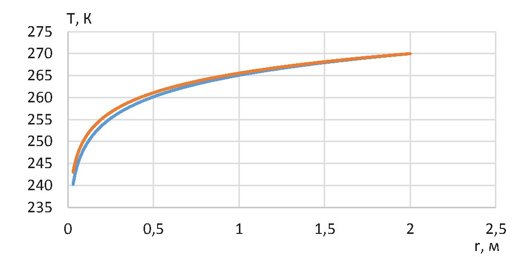 Тепловой поток на границе внешней поверхности термостабилизатора в силу незначительного изменения температуры хладагента в зазоре между внешней и внутренней трубами термостабилизатора (изменение порядка 3 К) практически не меняется и без оребрения равен примерно 1614 Вт. Такому потоку соответствует распределение температуры в грунте в пределах 2 м от термостабилизатора, представленное на рис. 8. Видно, что вблизи термостабилизатора грунт охлаждается эффективно. При наличии оребрения тепловой поток увеличивается до 1781 Вт, что больше на 10 %. Это приводит к более эффективному охлаждению грунта в пределах расстояния 1 м от термостабилизатора. Достоверность полученных результатов подтверждается сопоставлением модельных расчётов с данными, полученными коллективом авторов под руководством В.К. Васильева и В.А. Максименко, в которых радиус охлаждения грунта составляет 1 м, а температура в грунте снижается на 3–5 К [27].