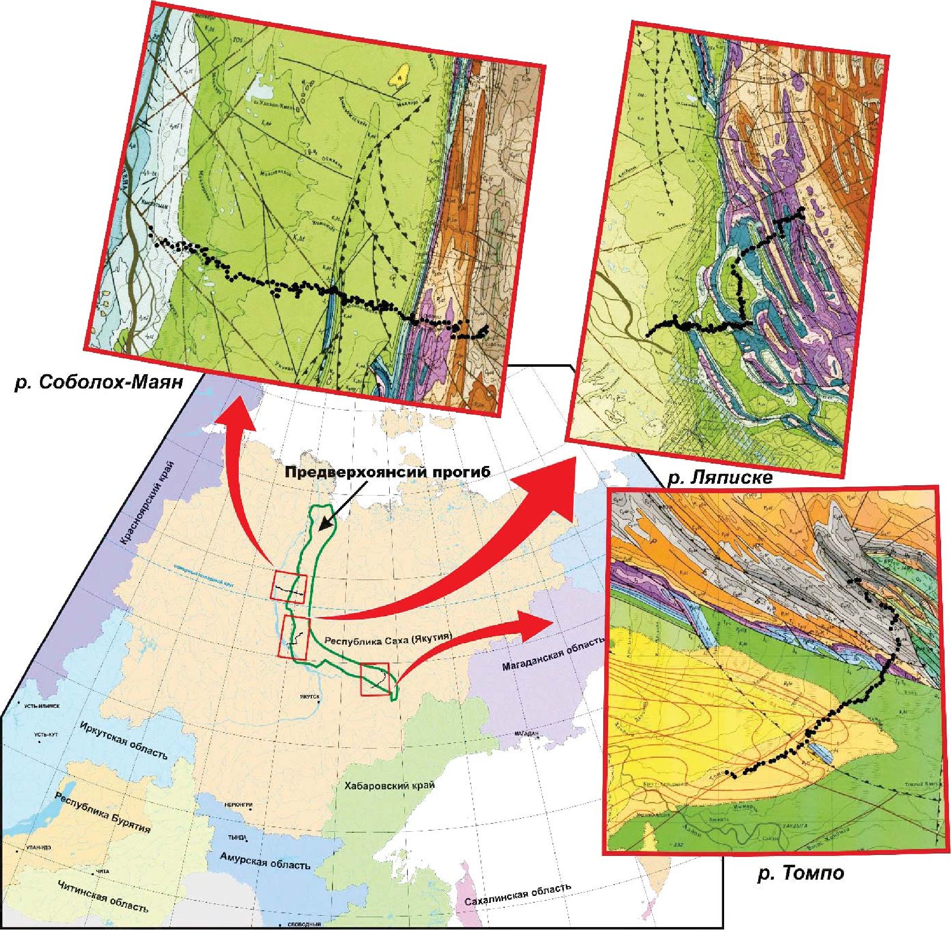 В течение двух полевых сезонов 2014 и 2015 гг. сотрудниками отдела гидрогеологии нефтегазоносных провинций и геоэкологии Сибирского научно-исследовательского института геологии, геофизики и минерального сырья в схожих геолого-тектонических условиях были пройдены полевые маршруты по рекам (с юга на север) Томпо, Ляписке и Соболох-Маян (Собопол) (рис. 1). Все полевые маршруты последовательно по направлению от истока к устью пересекли три типовых участка - горный, где на дневную поверхность выходят более древние, интенсивно дислоцированные отложения складчатого обрамления; пограничный – тектоническая зона форланда Верхоянского складчатого пояса (граница Сибирской платформы), и собственно сам прогиб с выходом в зону моноклинального погружения мезозойских отложений. Суммарная длина полевых маршрутов по трем рекам составила более 600 км.