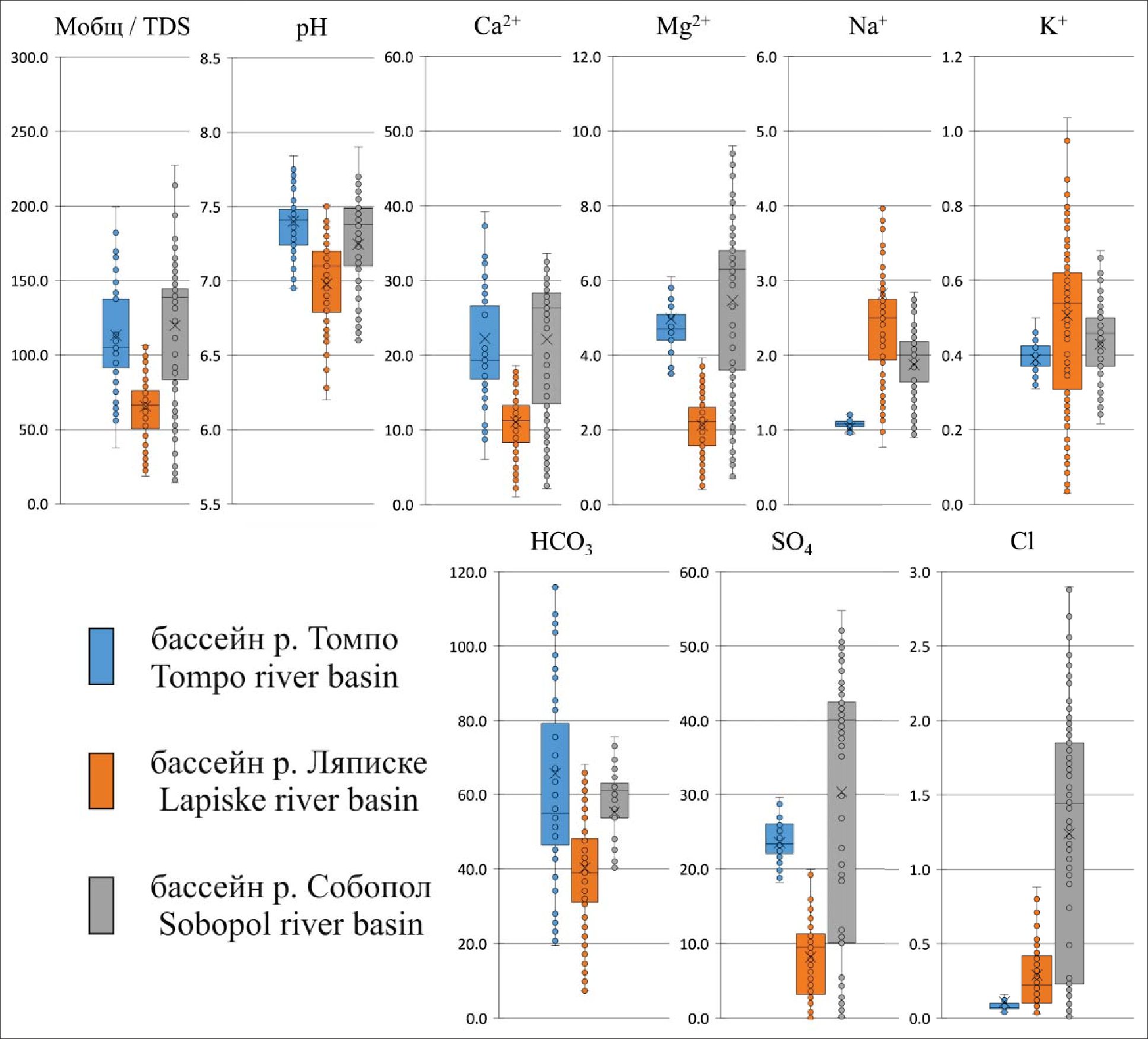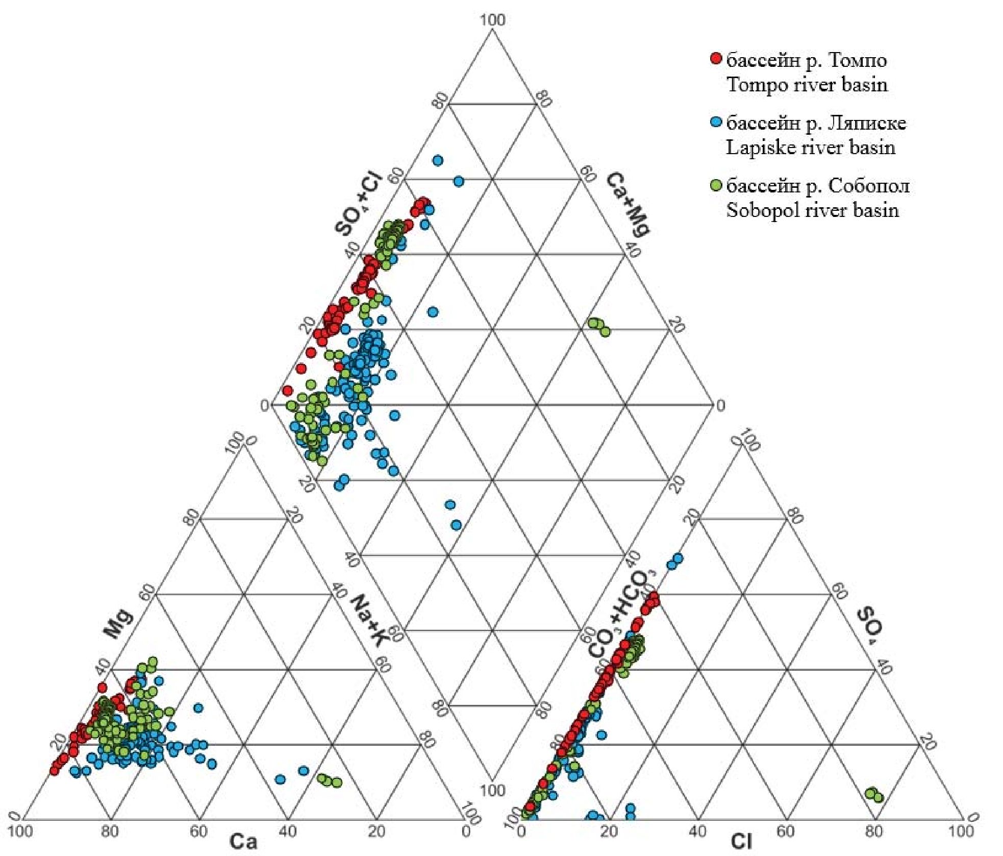 Среди катионов доминируют Ca2+ и Mg2+, а среди анионов – HCO3– и SO42–. Однако в бассейнах рек Ляписке и Соболох-Маян (Cобопол) встречены единичные водопункты с преобладанием хлорид-иона (до 78,3 %-экв) и иона натрия (до 65,7 %-экв). Данные пробы имеют нетипичный состав и сильно выбиваются из общей выборки, в связи с чем они были исключены из статистических расчетов.