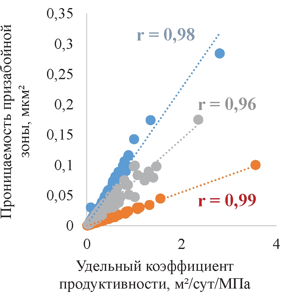 Методы КВД/КВУ обеспечивают определение проницаемости ПЗП за счет пересчета проницаемости удаленной зоны пласта (УЗП) в зависимости от дополнительного перепада давления вблизи ствола скважины, отражаемого в начальный период регистрации кривых восстановления давления. Данный принцип осложнен вторичными проблемами, например явлениями послепритока в скважину. Тем не менее исследование проведено на этих данных с целью нахождения корреляции проницаемости ПЗП с расчетным коэффициентом продуктивности. Нахождение статистической связи между рассматриваемыми параметрами обеспечивает обоснование достоверности данных интерпретации. Предлагаемый подход позволяет оценить проницаемость ПЗП без проведения ГДИС.