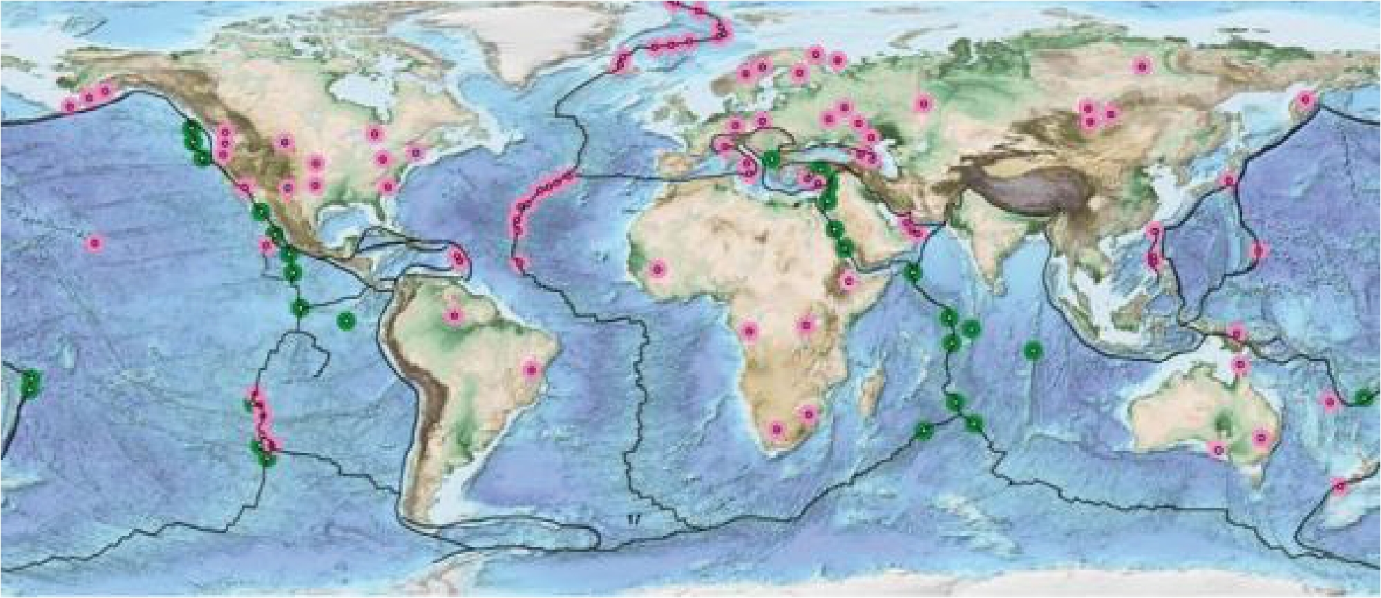 Выходы водорода, исходящего из глубин Земли, обнаружены в некоторых точках земного шара, привязанных к определённым геологическим структурам, в том числе на территории России, в Мали, Омане, Австралии, Бразилии, США, Южно-Африканской Республике и других странах [3–7]. Это возобновляемый первичный ресурс (как нефть, газ и уголь), который можно получить, пробурив скважину. Некоторые из этих природных месторождений можно увидеть на рис. 1 [7].