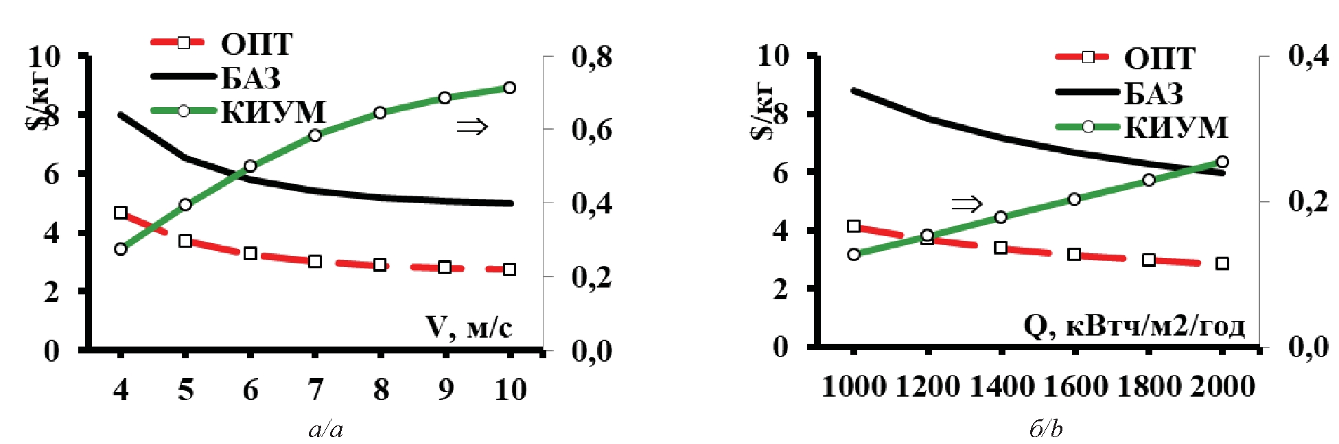 В рассмотренном диапазоне климатических условий ВЭУ и ФЭП вырабатывают электроэнергию стоимостью 2–9 цент/кВт×ч [23]. При хороших климатических условиях (V≥6 м/с, Q≥1400 кВт×ч/м2/год) и оптимистических значениях технико-экономических показателей стоимость электроэнергии составляет 3–4 цент/кВт×ч, стоимость водорода – 2,8–3,4 $/кг (рис. 3, а, б).