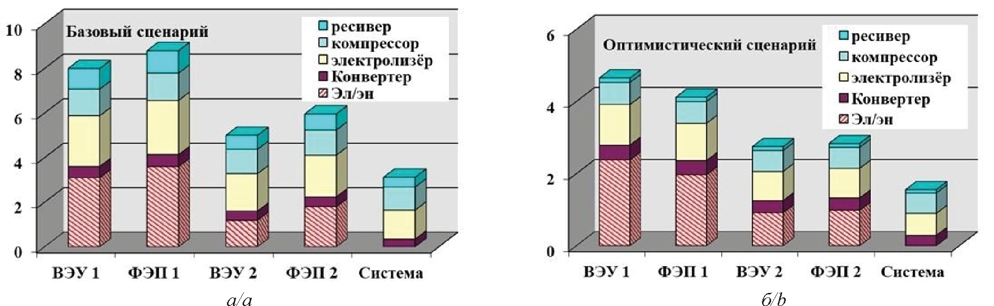 На основе опубликованных данных [1, 17–22] сформированы два сценария – базовый и оптимистический (таблица). Первый соответствует технико-экономическим показателям, достигнутым в настоящее время, второй – прогнозным на перспективу 10–15 лет. Удельные показатели приблизительно соответствуют мощности ВЭУ 1 МВт, электролизёра, компрессора и топливных элементов – 250 кВт, объему ресивера 1000 м3. Удельные показатели ФЭП, как известно, относительно слабо зависят от суммарной мощности вследствие модульной структуры.