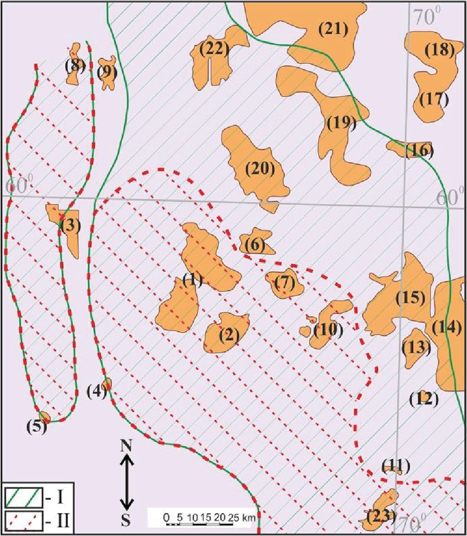 Fig. 5. Detailed distribution boundaries of the Bazhenov formation anomalous section based on well data within the oil and gas bearing area (I – zone of anomalous section (according to [21]); II – zone of anomalous section refined based on the results of studies. Deposits: 1 – named after А. Zhagrin, 2 – Zimnee, 3 – Zaozernoe, 4 – Severo-Vayskoe, 5 – Srednevayskoe, 6 – Endyrskoe, 7 – Irtyshskoe, 8 – Vostochno-Kamskoe, 9 – Yaplotskoe, 10 – Demyanskoe, 11 – Severo-Kalchinskoe, 12 – Nizhnelumkoyskoe, 13 – Verkhnelumkoyskoe, 14 – Severo-Komarinoe, 15 – Vareyagskoe, 16 – Salymskoe, 17 – Nizhneshapshinskoe, 18 – Sredneshapshinskoe, 19 – Chaprovskoe, 20 – Kondinskoe, 21 – Erginskoe, 22 – Zapadno-Erginskoe, 23 – Kalchinskoe)