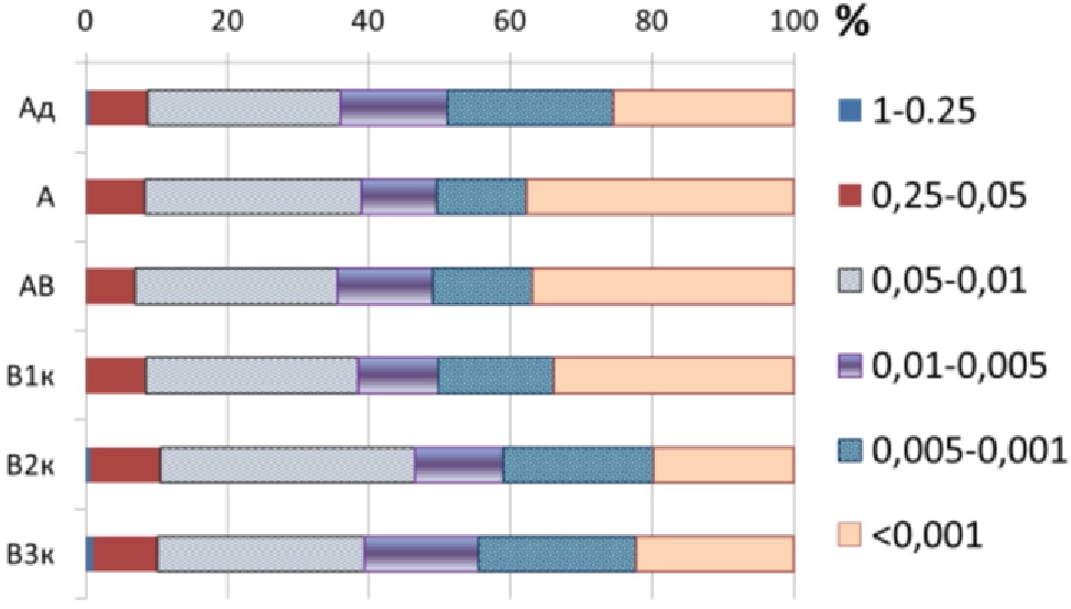 Изученный нами чернозем выщелоченный яблоневого сада опытной станции «Горно-Алтайское» является легкоглинистым по гранулометрическому составу (по отечественной классификации), за исключением горизонта В2к. С глубиной наблюдается изменение гранулометрического состава почвенных слоев (рис. 2): в горизонтах А, АВ и В1к преобладает илистая фракция, но в Вк горизонтах ее доля в гранулометрическом составе заметно уменьшается. В В2к горизонте происходит накопление фракции крупной пыли с размерами частиц 0,05–0,01 мм, а в нижнем окарбоначенном слое, примыкающем к подстилающим карбонатным глинисто-щебнистым отложениям, возрастает участие фракции мелкой пыли.