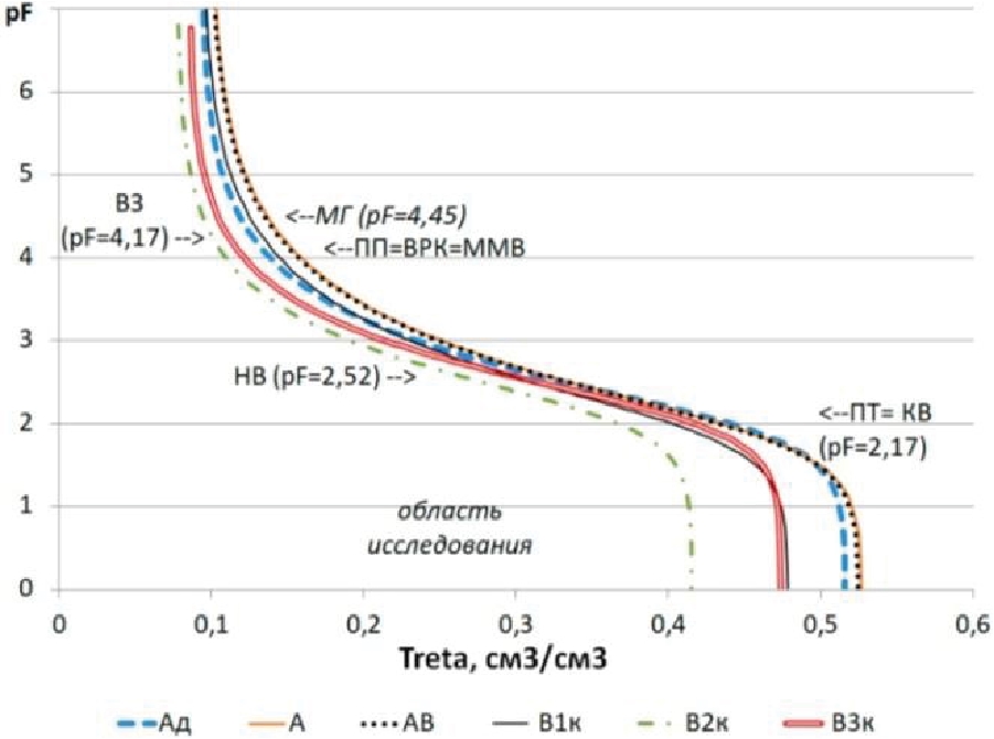 Вертикальное движение влаги в ненасыщенных влагой почвах характеризуется функцией влагопроводности – зависимостью между коэффициентом влагопроводности (Квл) и капиллярно-сорбционным давлением влаги в почве (Рк-с) [4]. В свою очередь, зависимость между Рк-с и влажностью описывается главной количественной характеристикой влагоудерживающей способности почв – ее основной гидрофизической характеристикой (ОГХ) [3], отражающей практически все основные особенности состава и структуры почвенного горизонта. В современной количественной гидрологии почв для расчета переноса влаги в почве на основе ОГХ принято использование прогнозных математических моделей, например, удобной и доступной программы HYDRUS-1D, представляющей собой физически обоснованную модель влаго-, тепло- и солепереноса [5]. ОГХ, аппроксимированная уравнением Ван-Генухтена, и коэффициент фильтрации являются ее основным экспериментальным обеспечением.