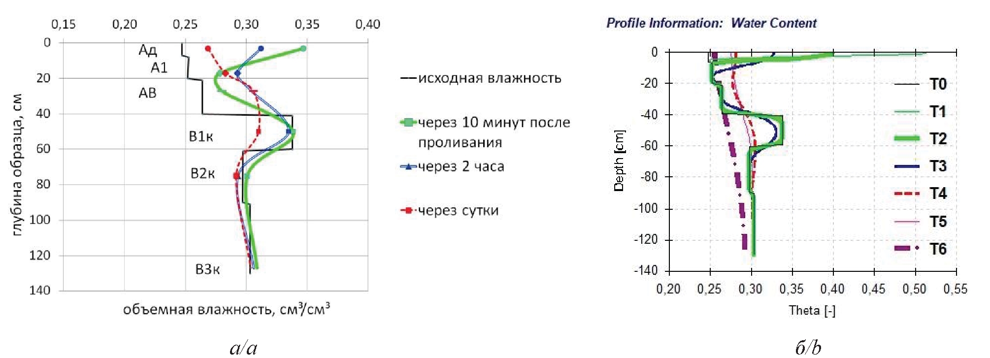 На рис. 6 приведены результаты послойного изменения содержания влаги во время проведения почвенно-мелиоративного эксперимента. Судя по представленным профилям движения влаги в изучаемой почве, в реальных условиях влага уже через 10 минут после дождевания начинает медленно проникать в глубину, и влажность всех А горизонтов на этом этапе эксперимента уже становится выше, чем исходная (светлая толстая линия на рис. 6, а). Однако результаты моделирования в Hydrus-1D на этом этапе не вполне сходятся с реальными значениями: согласно модели, в первые 10 минут практически вся влага задерживается в верхнем горизонте, увлажняя его до 0,4 см3/см3 (светлая толстая линия Т2, рис. 6, б). Из-за низкого давления в А горизонте (Р= –978 см водн. ст., табл. 5) влага не может стекать вниз, в горизонт АВ с более высоким капиллярно-сорбционным давлением (Р= –788 см. водн. ст.), пока горизонт А не увлажнится и пока не возникнет соответствующий градиент давления. Некоторое несоответствие между измеренными и расчетными данными влажности, возможно, вызвано тем, что при моделировании мы не учитывали горизонтальное движение влаги на заливочной площадке.