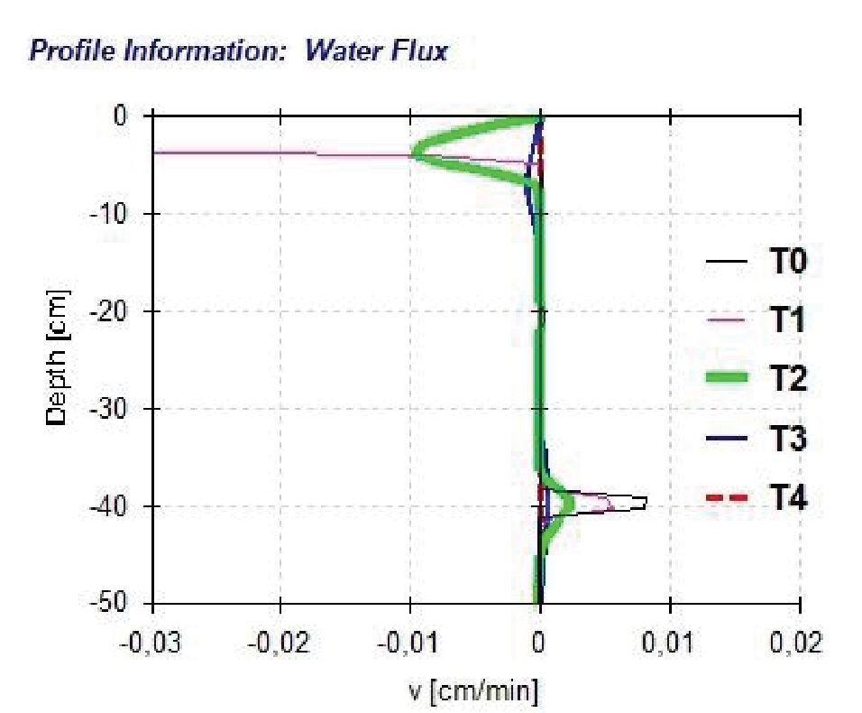 Через 10 минут после дождевания (рис. 7) скорость водного нисходящего потока снизилась в верхнем горизонте до 0,098 мм в минуту, или 1,4 см/сут. (Т2, толстая светлая линия), но фронт увлажнения проникает уже на более значительную глубину – до 18 см, с постепенным снижением скорости водного потока на глубине до 0,0014 см/сут. Через 2 часа скорость водного нисходящего потока продолжала снижаться и составляла уже в верхнем горизонте не более 0,0067 мм/мин, или 0,95 см/сут. Скорость положительно направленного потока на глубине 40 см через 10 минут после начала эксперимента на достигала 2,16 см/сут. Через 24 ч во всей почвенной толще чернозема выщелоченного содержание влаги выравнивается, движение влаги практически на всей глубине происходит только вверх (положительные потоки влаги) – от 0,000089 мм/сут. в глубоких слоях до 0,000175 мм/сут. в верхнем горизонте.