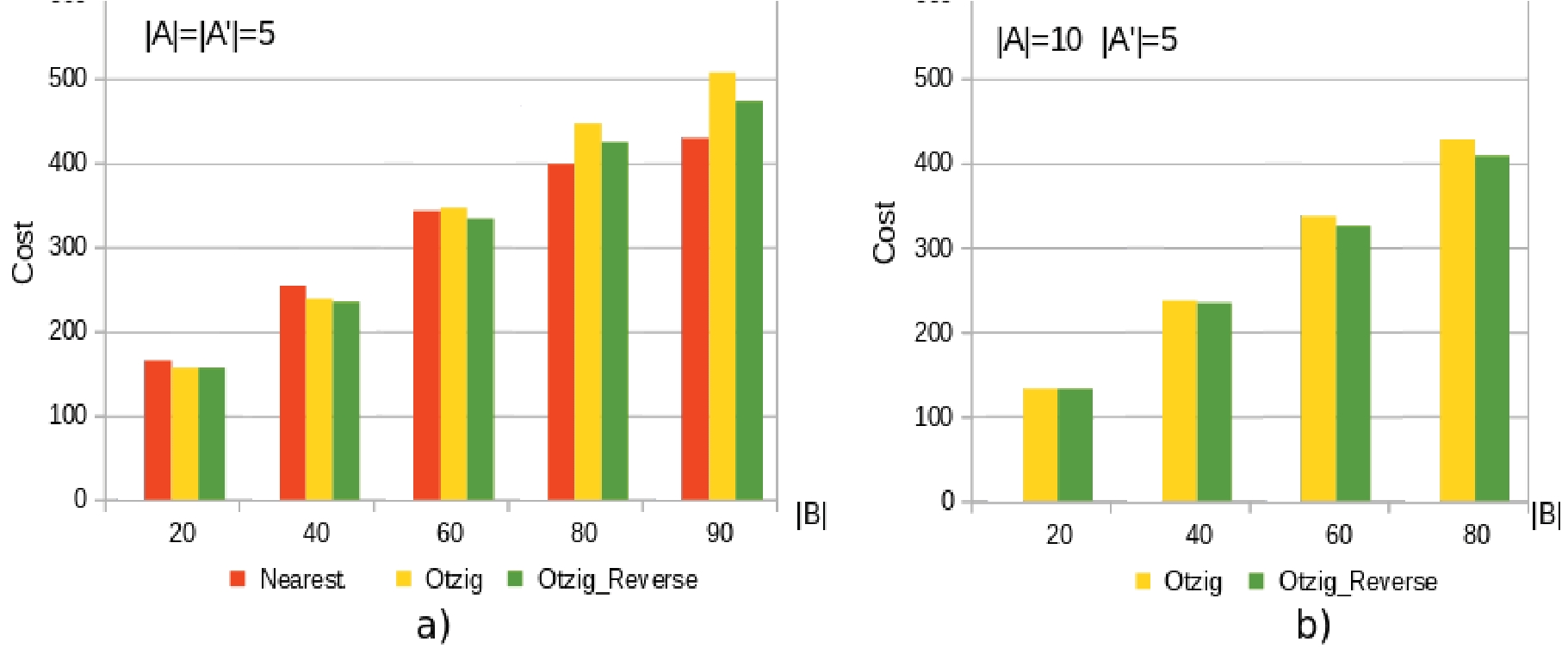 На рис. 4, a показан случай, когда |𝐴|=|𝐴′|=5. Видно, что для небольших значений |𝐵| лучший результат дает алгоритм 𝑂𝑡𝑧𝑖𝑔𝑅𝑒𝑣𝑒𝑟𝑠𝑒. Для больших значений |𝐵| лучший результат дает алгоритм 𝑁𝑒𝑎𝑟𝑒𝑠𝑡.