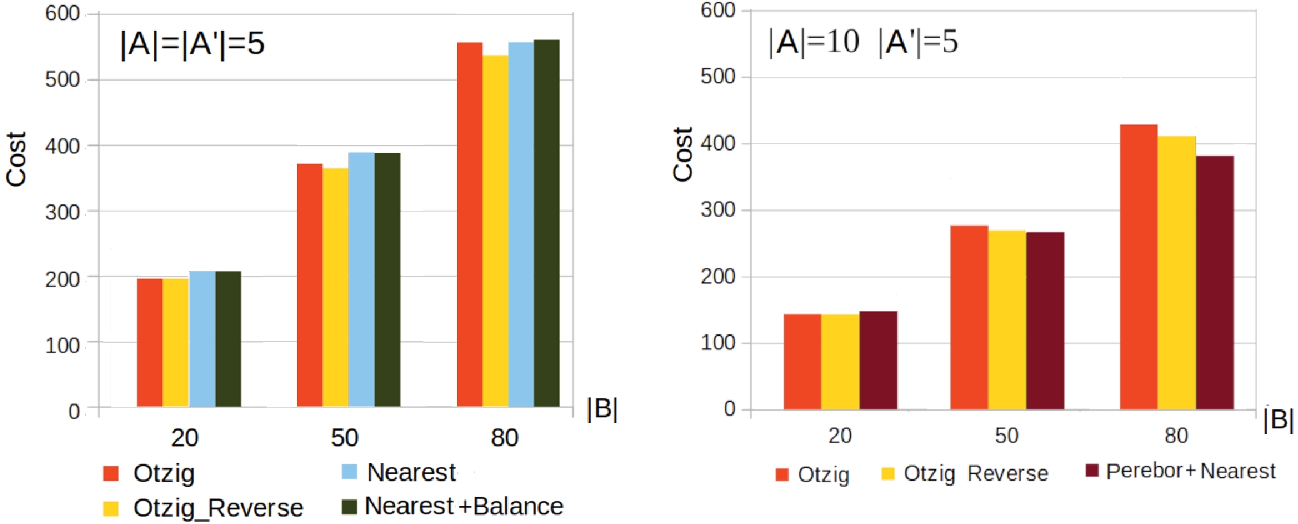 Рис. 5. Сравнение результатов работы алгоритмов с использованием балансировки и перебора для |𝐴|=|𝐴′|=5 (слева) и |𝐴|=10, |𝐴′|=5 (справа)