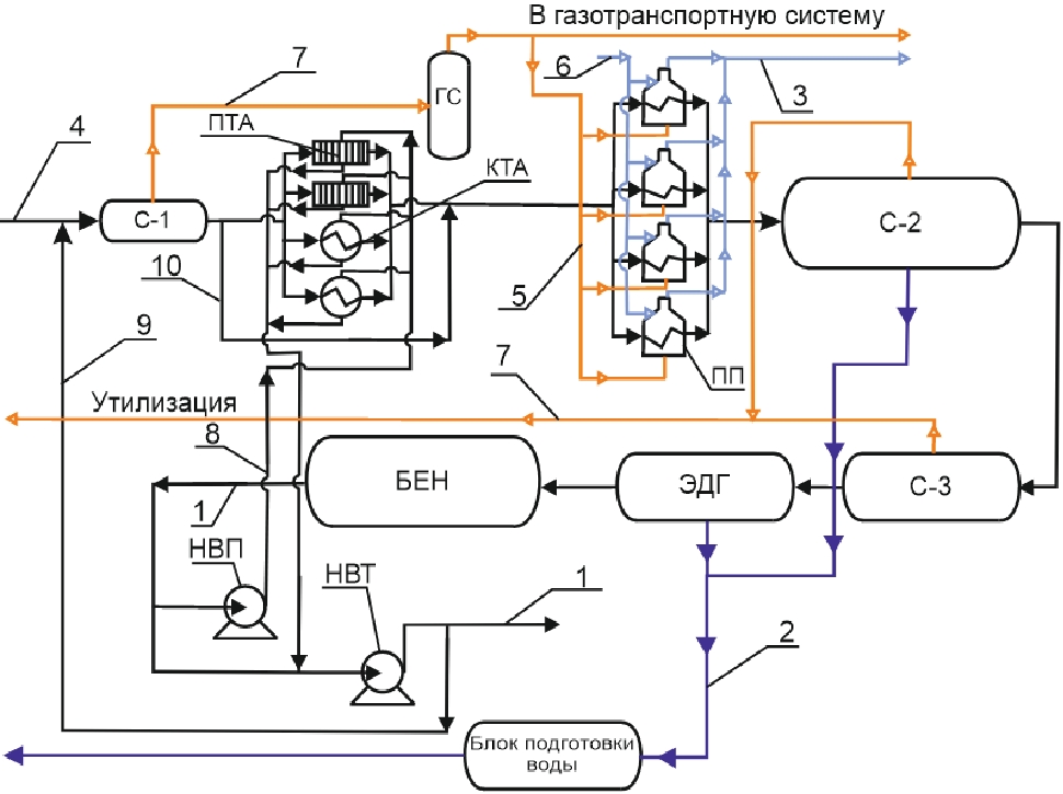 Рис. 1. Принципиальная технологическая схема УПСН: 1–поток товарной нефти; 2 – поток подтоварной воды; 3 – поток отходящих дымовых газов; 4 – поток сырой нефти; 5 – поток топливного газа; 6 – поток воздуха на горение; 7 – поток попутного нефтяного газа; 8 – поток части товарной нефти; 9 – рецикл товарной нефти на смешение с сырой нефтью; 10 – байпас сырой нефти в обход системы рекуперативного теплообмена; С-1 – сепараторы первой ступени; ПТА – пластинчатый теплообменный аппарат; КТА – кожухотрубчатый теплообменный аппарат; ГС – газовый сепаратор; ПП – путевой подогреватель; С-2 – сепараторы второй ступени; С-3 – сепараторы третей ступени; ЭДГ – электродегидратор; БЕН – буферная емкость нефти; НВП – насос внутренней перекачки; НВТ – насос внешнего транспорта