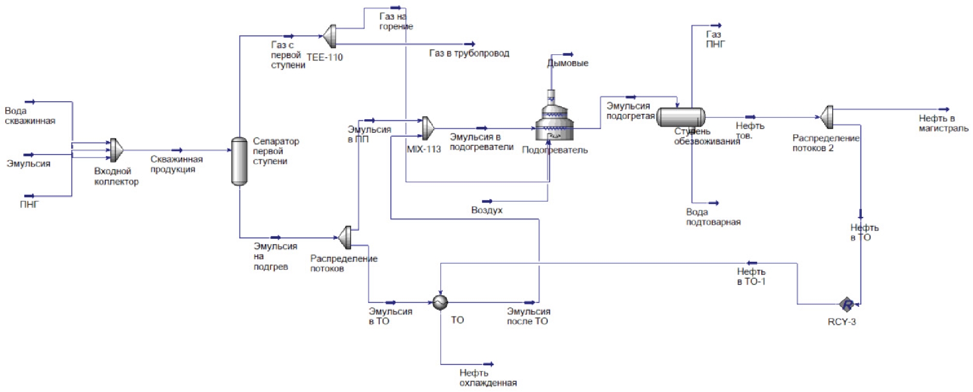 В данной работе оптимизирована СТО УПСН мощностью по сырью ~4 млн т/год. Установка состоит из блока электродегидраторов, системы сепараторов, системы теплообмена, включающей теплообменники различных типов и путевые подогреватели, несколько насосных станций и факельную систему (рис. 1).