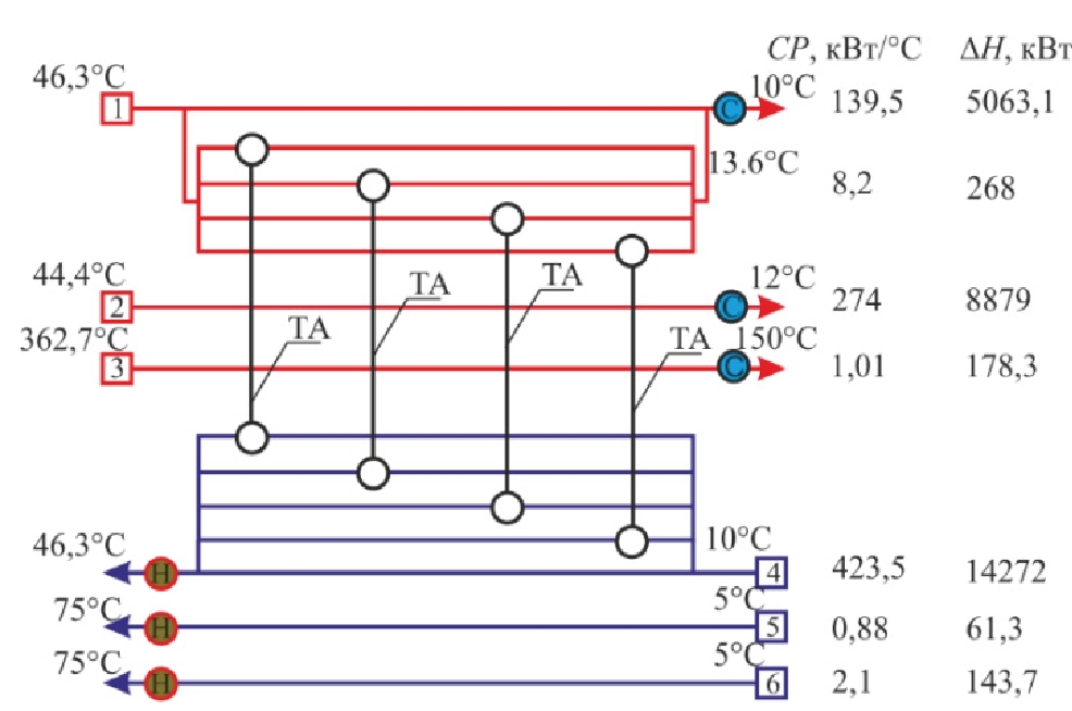 Температура пинча горячих технологических потоков для исходной системы теплообмена равна THP=46 °C и TСP=10 °C соответственно, что определяет локализацию области пинча [12]. Основные теплоэнергетические параметры для СТО с минимальной движущей силой теплообмена, равной DTmin=36 °С, представлены в табл. 3.