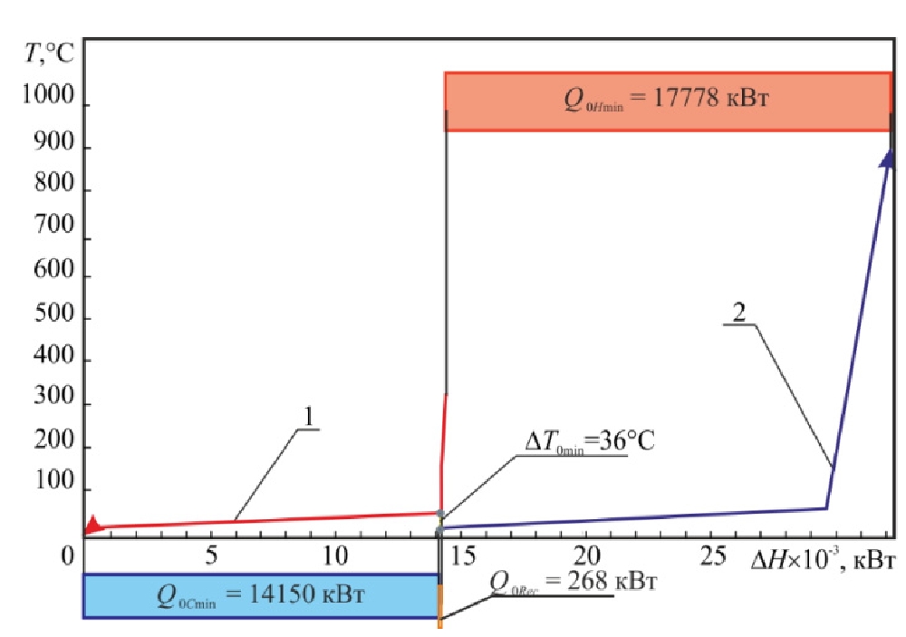 Fig. 5. Composite curves of the existing HEN OPSU: 1 – hot composite curve; 2 – cold composite curve; DT0min – minimum temperature difference between the heat carriers in the heat exchange equipment in the existing HEN of the unit; Q0Cmin – power of the cold utility; Q0Hmin – power of the hot utility; Q0Rec – heat recuperation power in the HEN