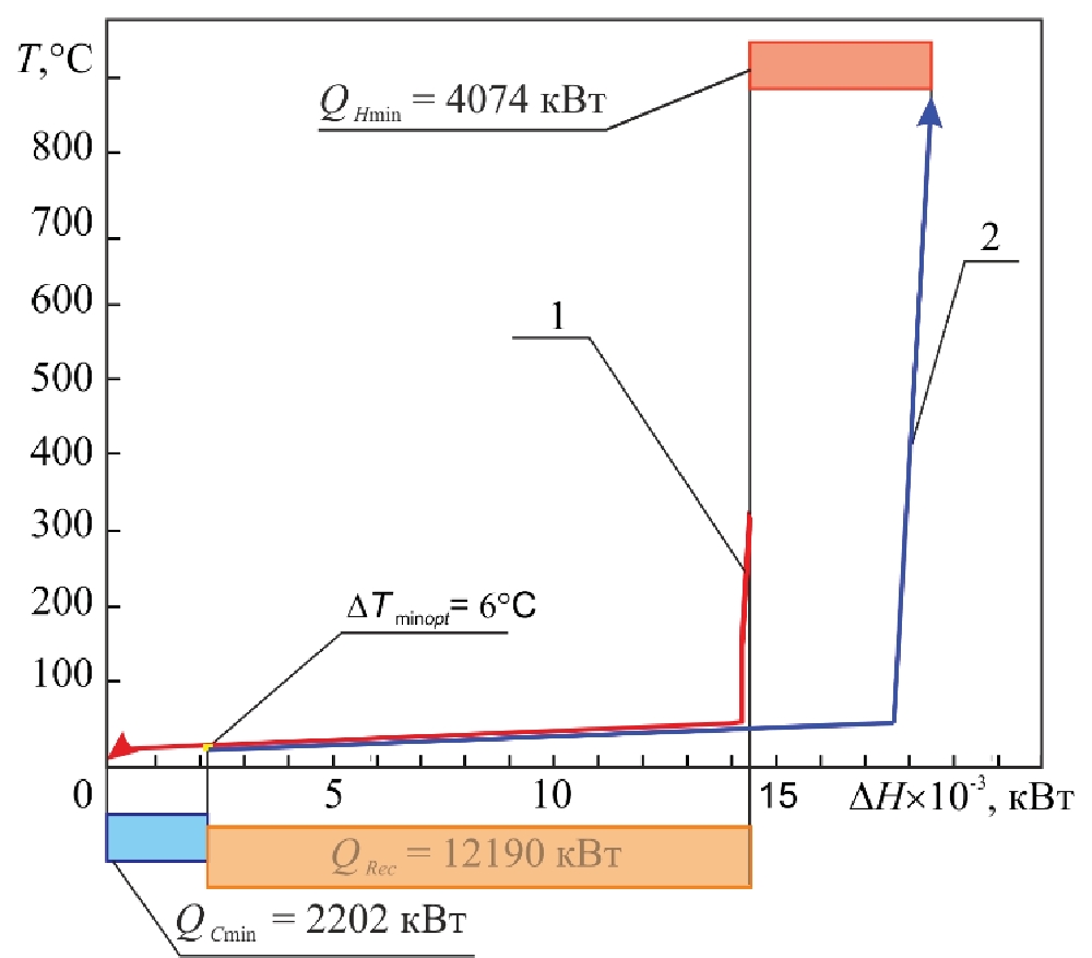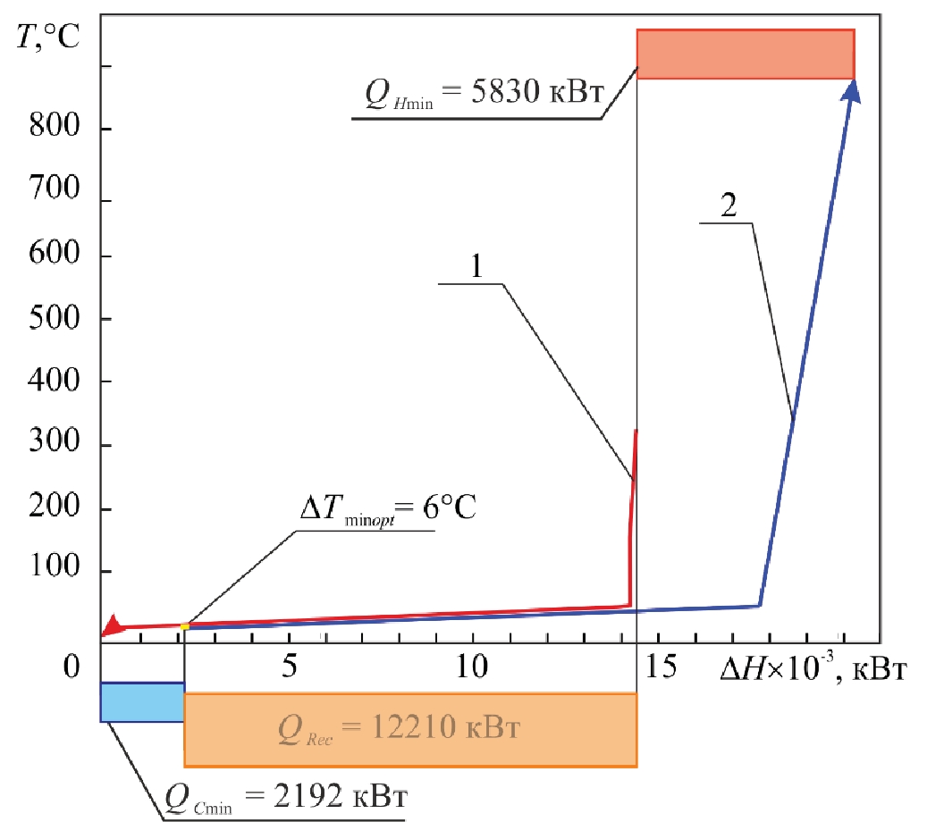 Рис 7. Составные кривые для проекта СТО: 1 – горячая составная кривая; 2 – холодная составная кривая; DTmin opt – минимальная разность температур между теплоносителями в теплообменном оборудовании для проекта СТО установки; QCmin – мощность холодной утилиты; QHmin – мощность горячей утилиты; QRec – мощность рекуперации теплоты в СТО