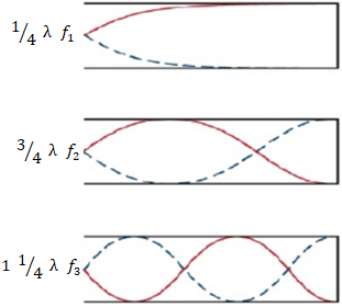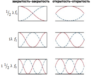 В трубопроводах конечной длины образуются так называемые стоячие волны, или собственные колебания системы. Для трубопроводов с открытыми и/или замкнутыми граничными условиями конкретная длина труб определяет акустические собственные частоты. Если длина линии совпадает с целыми числами, кратными половине или четверти длины волны, то в зависимости от комбинации условий открытого или закрытого конца может возникать акустический резонанс. Конечные условия определяются как открытые или закрытые. Для полуволновых резонансов конечные условия должны быть одинаковыми, т. е. «открытость–открытость» или «закрытость–закрытость». Для четвертьволновых резонансов конечные условия должны быть противоположными, т. е. один открытый конец и один закрытый конец. Примеры таких конфигураций показаны на рис. 1, 2.
