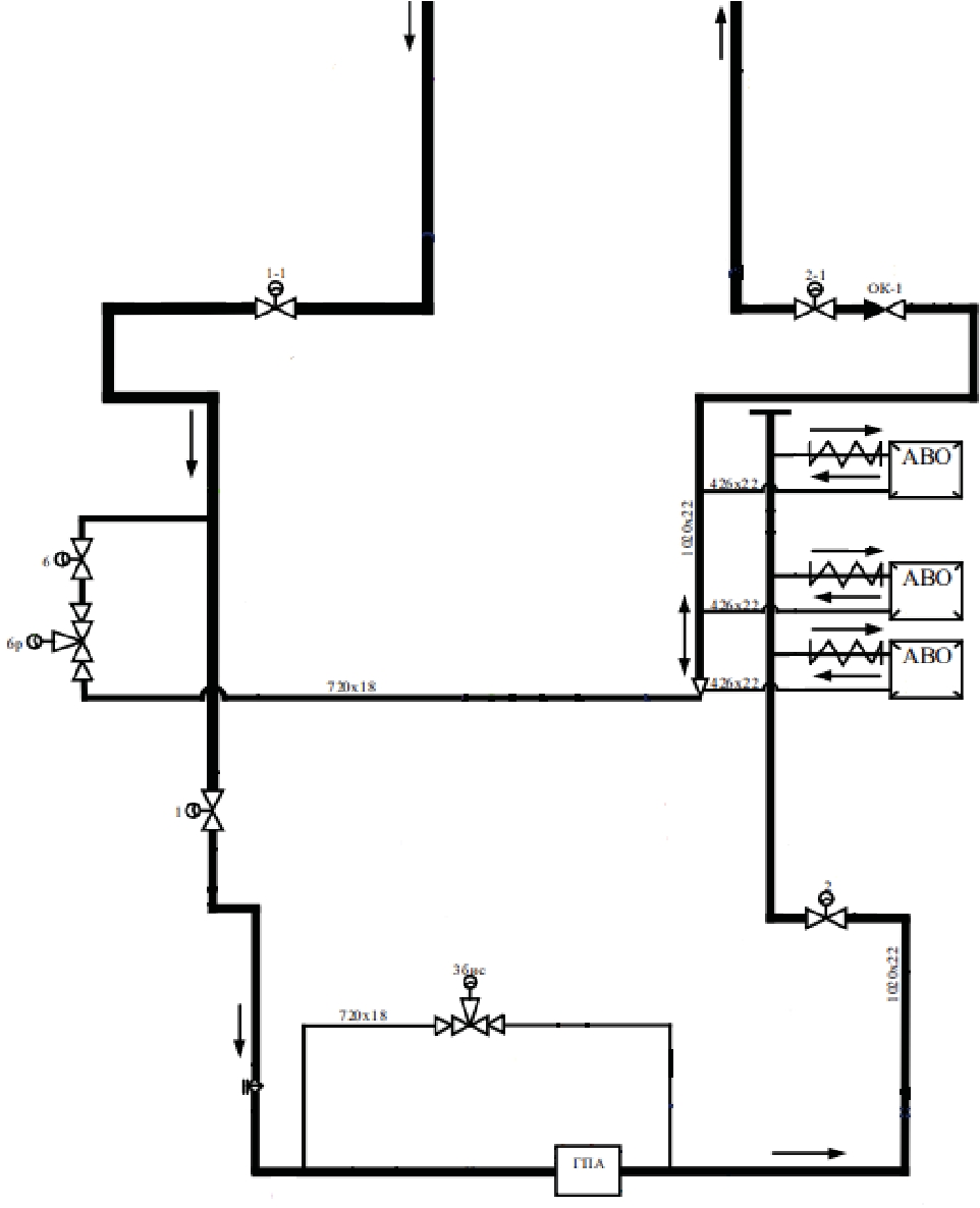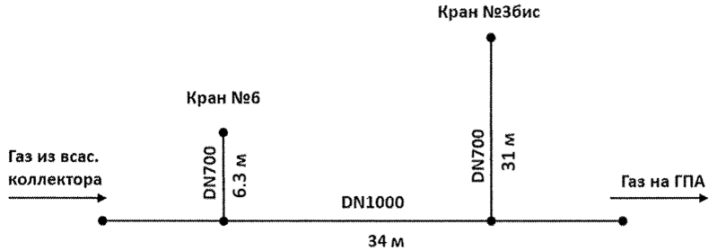 На рис. 3 изображена технологическая обвязка компрессорного цеха. С входного коллектора газ распределяется по обвязкам DN=1000 через краны № 1 и 1-1. При работе газоперекачивающего агрегата участки трубопровода DN=700 c кранами 6 и 3бис являются тупиковыми ответвлениями. В зависимости от режимов работы компрессорного цеха могут возникать низкочастотные пульсации различной амплитуды. В работах [4, 17] были приведены попытки оценки низкочастотных пульсаций трубопровода с помощью диагностики и программного моделирования. Используя программное обеспечение, попробуем оценить низкочастотные пульсации, возникающие в тупиковых ответвлениях.