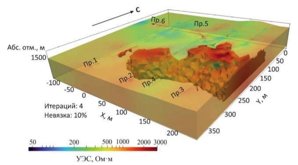 Результаты инверсии данных ЭТ позволяют определить геоэлектрическое строение участков верхней части разреза до глубины около 50 м. На первом этапе интерпретации была получена геоэлектрическая модель коренника на основе трехмерной инверсии данных (рис. 2). Инверсия была выполнена с учетом рельефа, который может влиять на результаты исследований [11, 12] в программе DiInSo (Версия 2.5 от 25.04.2023) [13, 14]. В процессе решения обратных задач (используется схема Гаусса–Ньютона) требуется построение тетраэдральной сетки, в отличие от широкоизвестной программы Res3dinv, в которой используется прямоугольная [15, 16]. Поскольку межгорные впадины имеют сложное геоэлектрическое строение, модель точнее разбивается тетраэдральной сеткой. В программе есть удобная возможность изменять параметры инверсии в зависимости от поставленной задачи с целью получения наиболее приемлемого результата, например, что в конкретном случае важнее – установить геометрию объекта или его сопротивление. Так, в нашем случае мы меняли параметр регуляризации, скорость роста ячеек с глубиной и ограничивали максимальный размер ячеек генерируемой сетки. Как известно, обратная задача некорректна и может иметь множество решений, поэтому для заверки полученных моделей применяют численное моделирование, как двумерное, так и трехмерное, как, например, в работах [17, 18]. Таким образом, следующим этапом интерпретации было численное моделирование. Общая геометрия объекта оценивалась по результатам трехмерной инверсии и космоснимка; размеры выхода коренных пород, углы наклона предположительных его границ вблизи профилей 1, 2 и 3 оценивались по результатам двумерной инверсии полевых данных. Исходя из привязки к геологическим данным породы фундамента представлены метаморфическими образованиями ордовикского возраста [19], характеризующимися повышенными значениями удельного сопротивления (1000–2000 Ом∙м) по сравнению со вмещающими породами осадочного заполнения впадины (до 700 Ом∙м), представленными озерно-ледниковыми и ледниковыми отложениями – валунным галечником, гравием, валунником и песком [7]. Основываясь на вышесказанном, при формировании моделей были выбраны следующие значения УЭС: для выхода коренных пород – 2000 Ом∙м, для вмещающей среды – 588 Ом∙м.