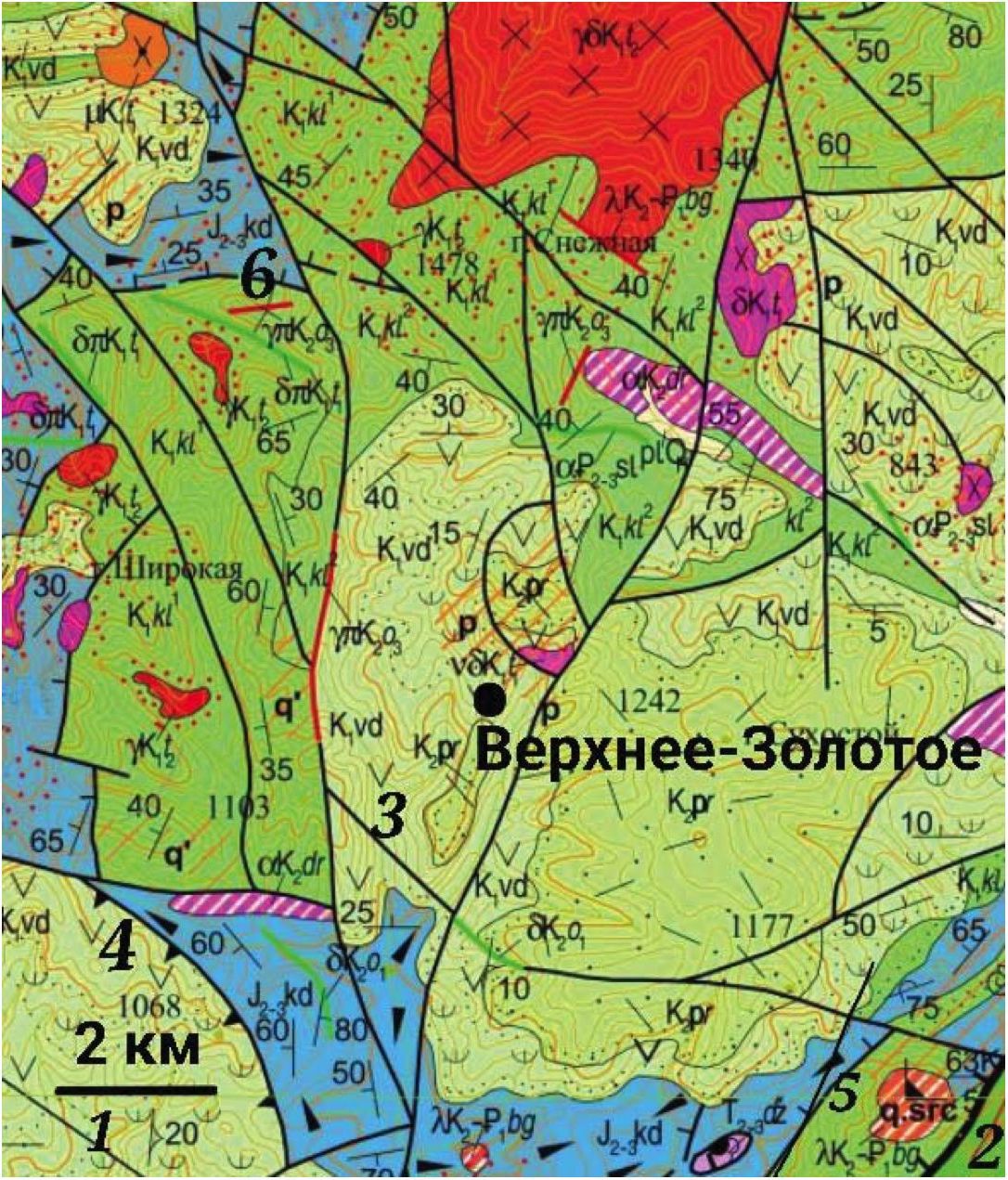 Рис. 2. Геологическая карта окрестностей месторождения Верхнее-Золотое масштаба 1:200000 [8]. Условные обозначения: Юра средняя–поздняя: J₂₋₃kd – кададинская толща, терригенные отложения, аллоолистостромы. Мел ранний: K₁kl₁ – ключевская свита первая толща, терригенные отложения; K₁kl₂ – ключевская свита вторая толща, терригенные отложения; K₁vd – верхнедальненская толща, вулканиты среднего и кислого состава; комагматы: βK₁vd – субвулканические массивы андезитов, дацитов; ζK₁vd – субвулканические массивы риолитов; татибинский гранит-диоритовый плутонический комплекс, первая фаза: δρK₁t₁ – дайки диорит-порфиритов, вторая фаза: γK₁t₂ – интрузии гранитов, δK₁t₂ – интрузии диоритов. Мел поздний: γρK₂o₃ – ольгинский гранитный плутонический комплекс, третья фаза, дайковые тела гранит-порфиров. Эоцен: P2-3sl – салибезский комплекс базальтовый вулканический, дайковые тела базальтов. Границы: 1 – геологическая достоверная; разрывные нарушения: 2 – надвиги достоверные главные, 3 – неустановленной кинематики, 4 – разломные границы вулкано-тектонических структур достоверные, 5 – надвиги достоверные, 6 – надвиги достоверные, не выходящие на картографируемую поверхность. Метасоматические изменения: q` – окварцеванные породы; p` – пропилитизированные породы; q.src – кварц-серицитовые изменения