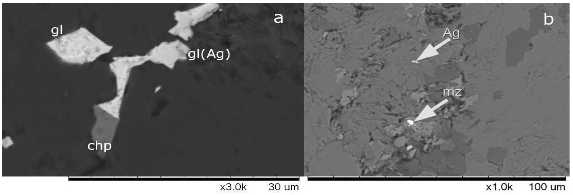 Fig. 4. a) hypidiomorphic galena (gl) with an admixture of silver (gl(Ag)) with xenomorphic chalcopyrite (chp) in metasomatic quartz; b) native silver (Ag) with xenomorphic monazite (mz) in an aggregate of metasomatic sericite and quartz
