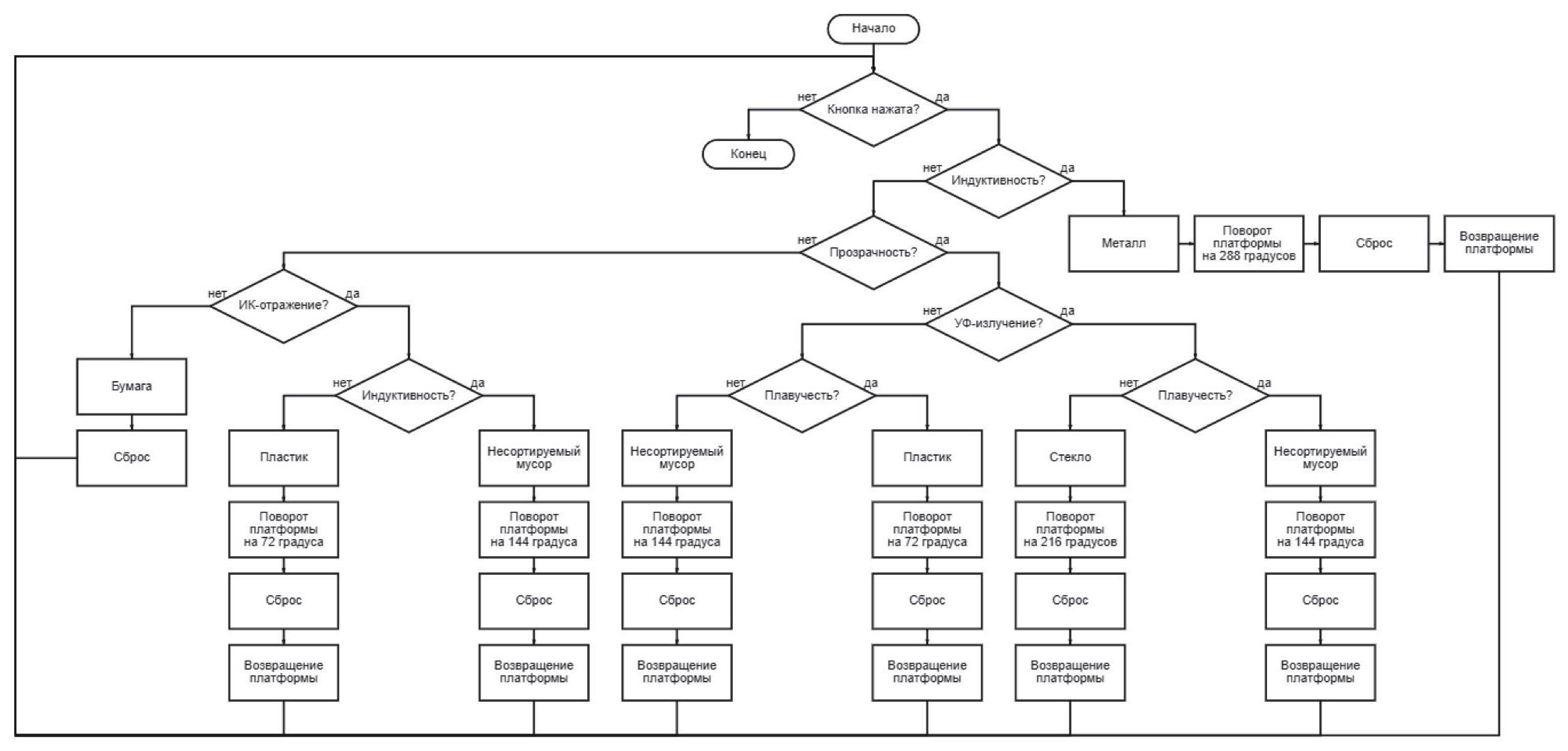 После идентификации мусора платформа, на которой установлены контейнеры для разных видов мусора, поворачивается на определенное количество градусов, в зависимости от типа мусора, и подставляет соответствующий контейнер для сброса мусора. Затем платформа возвращается в исходное положение, ожидая следующего цикла сортировки.