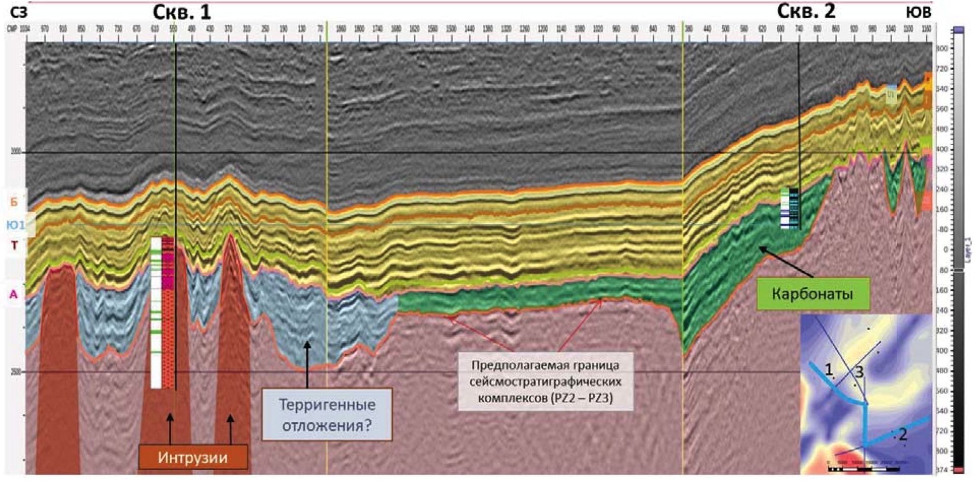 По характеру сейсмической волновой картины выделяется как хаотическая, так и регулярная волновая картина. В соответствии с сейсмогеологическим районированием В.А. Конторовича, хаотическая запись с наибольшей вероятностью сформирована магматическими породами, а регулярная – моноклинальными и погруженными блоками. В северо-западной части разведочной Скважиной 1 было вскрыто интрузивное магматическое тело, а вблизи юго-восточного окончания профиля на геологической карте ЗапСибНИИГГ [16] выявлены выходы среднего палеозоя, также представленного магматическими породами. Скважина 2 вскрыла карбонатные отложения на юго-восточном участке профиля, которые соответствуют регулярной сейсмической записи с повышенной амплитудой. По сейсмогеологичекому районированию это блоки моноклинальных и погруженных карбонатных пород.