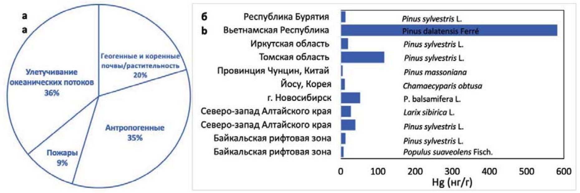 Fig. 1. Ratio of the contribution of the main sources to global mercury emissions: a) [19–22]; b) concentrations of Hg in annual rings of different pine species in different study areas [3, 5, 7, 10, 23]