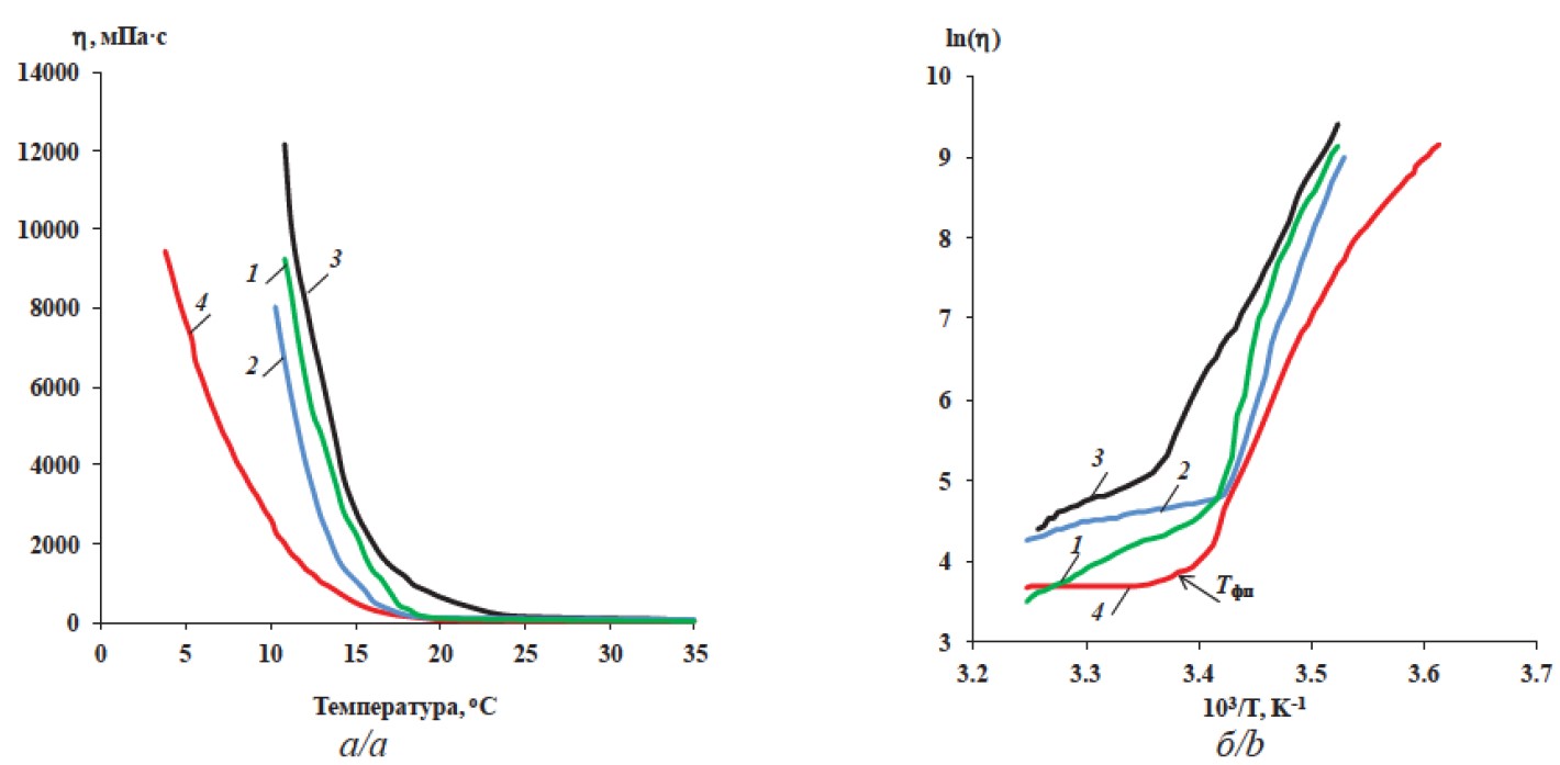 На рис. 1, б представлены полулогарифмические зависимости ln(h) вязкости нефти от обратной температуры 1/Т при различных режимах термоститирования. Для всех образцов с понижением температуры до точки фазового перехода отмечено незначительное монотонное увеличение вязкости, после Тфп для всех образцов наблюдается резкий скачок вязкости в области пониженных температур.